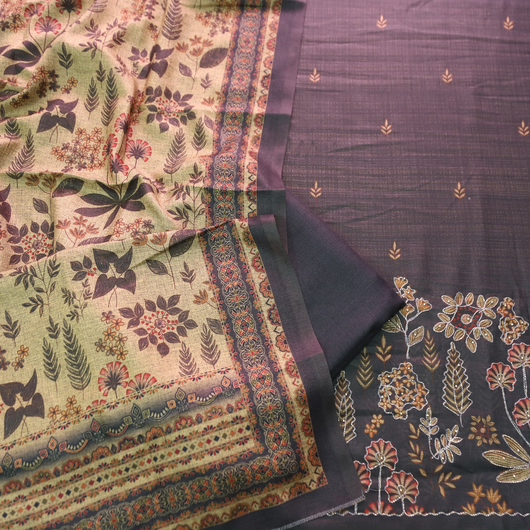 तमन्ना Faded Black Balanced By Floral Printed and Aari Work Semi Pashmina Winter Set