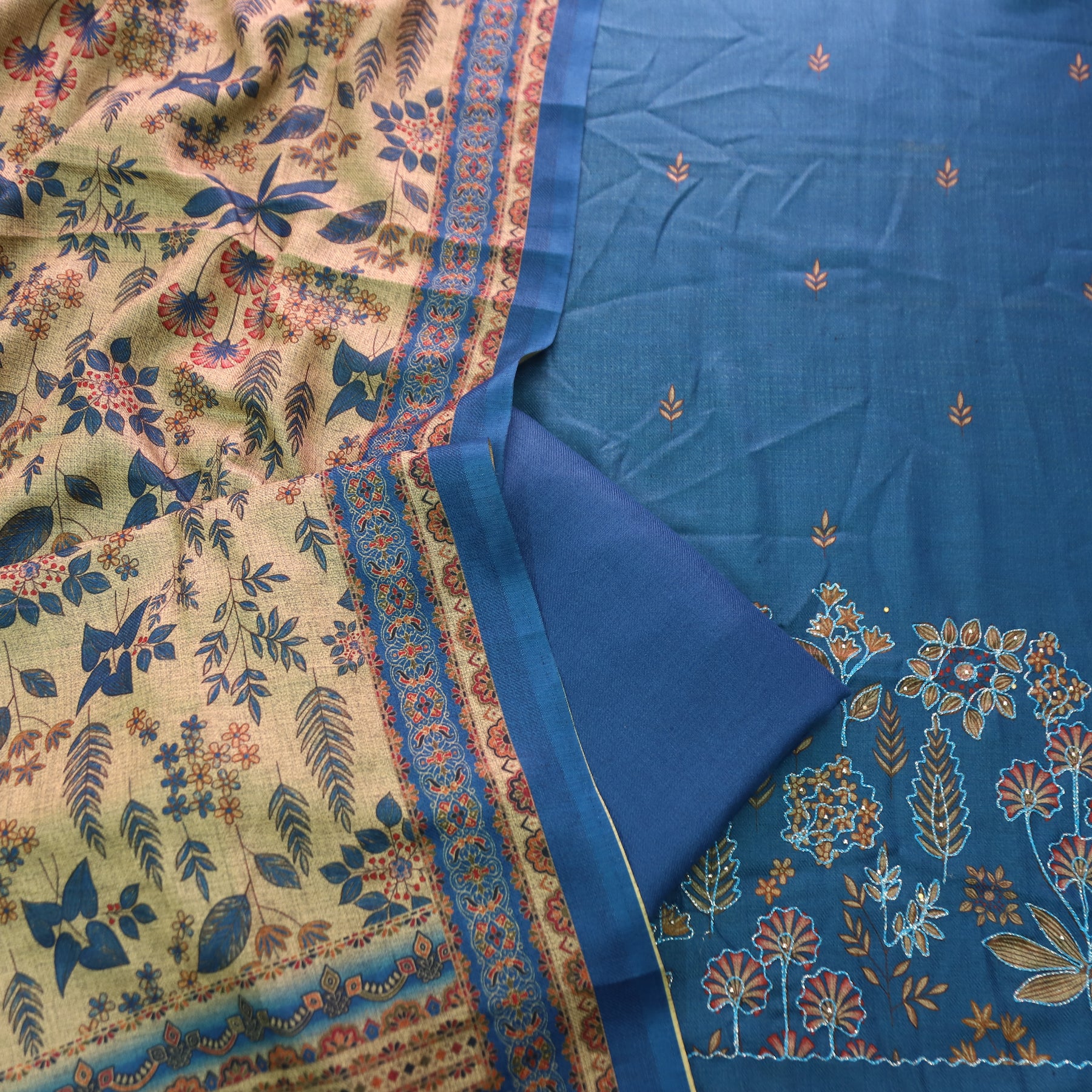 तमन्ना Denim Blue Balanced By Floral Printed and Aari Work Semi Pashmina Winter Set