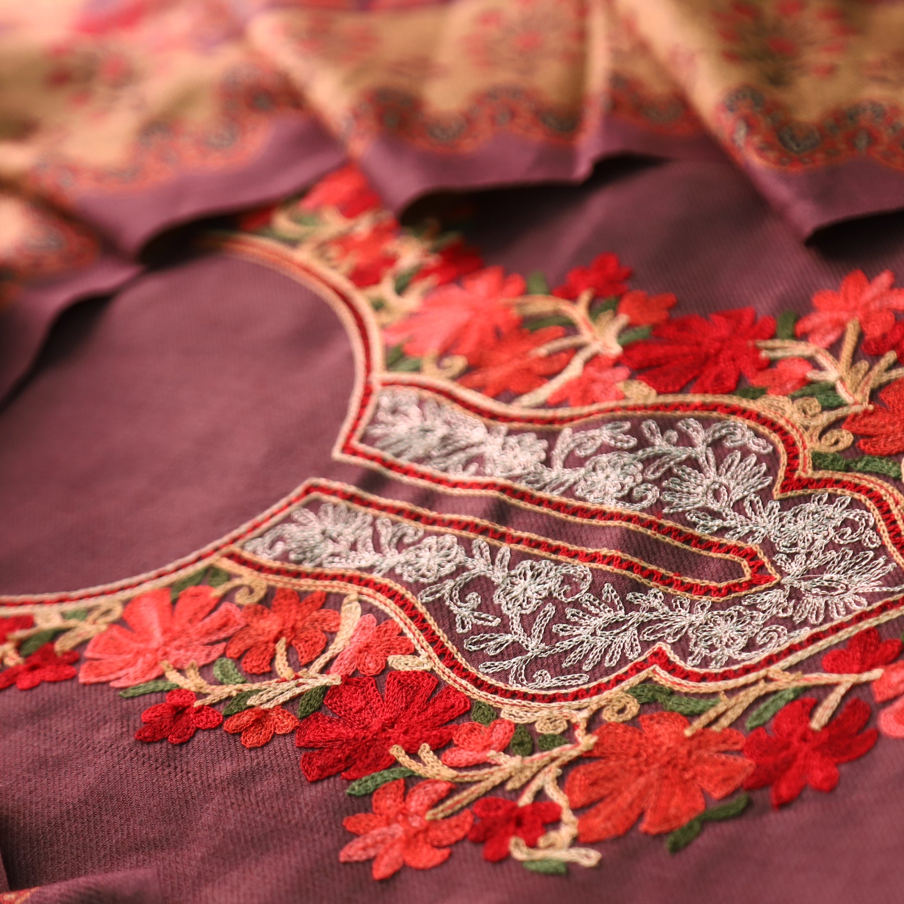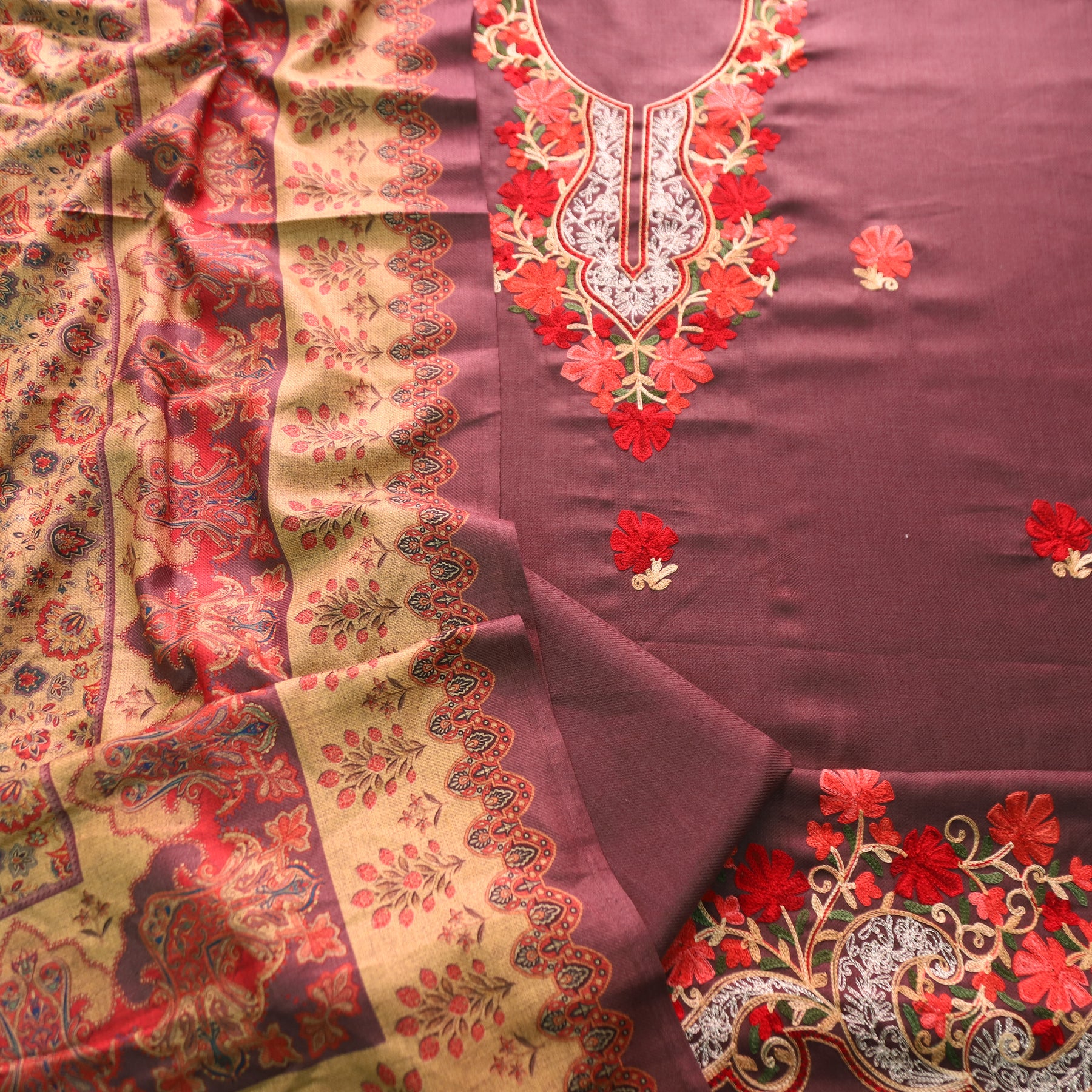 कनक Mulberry Mauve Kashida Embroidery Work Semi Pashmina Winter Set