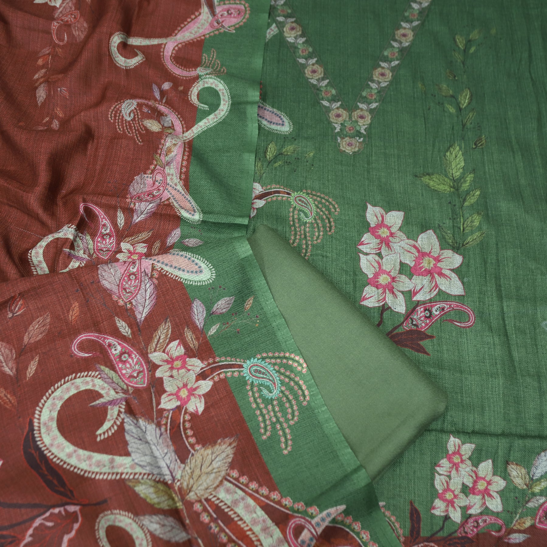 Work- This semi-pashmina suit set features a beautifully printed top with floral and paisley motifs, enhanced with subtle floral accents on the neckline. Paired with a plain matching bottom and a contrasting floral-printed dupatta, it offers a perfect fusion of warmth, color, and elegance for winter wear.