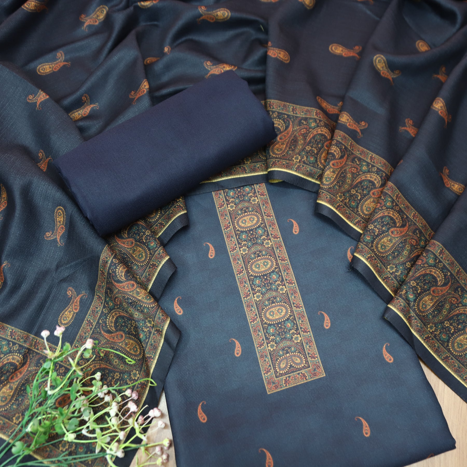 रुबीना Cosmic Blue Elegant Digital Self Printed and Hem Semi Pashmina winter Set