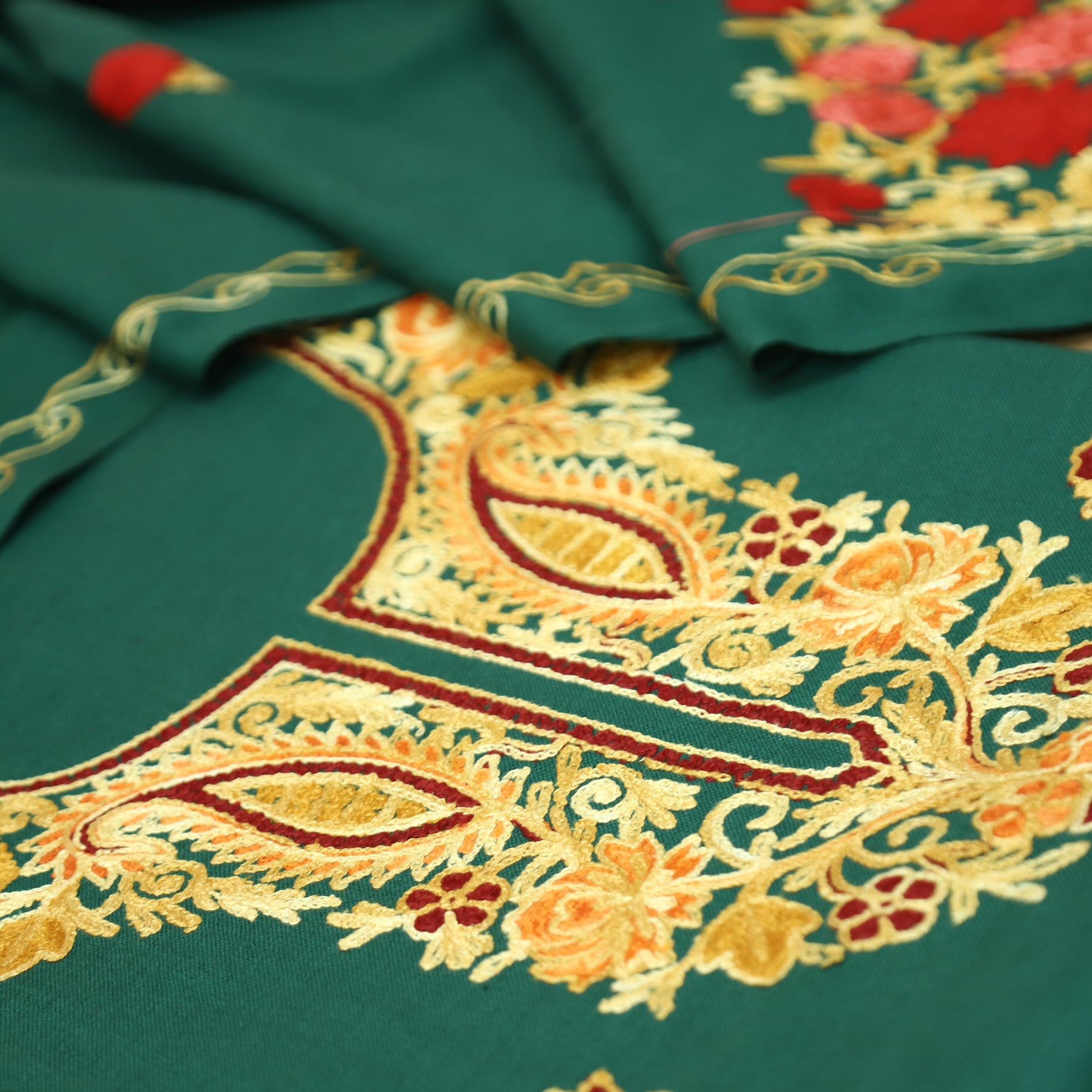 योगिनी Dark Emerald Woven with Kashida Embroidery Semi Pashmina Winter Set