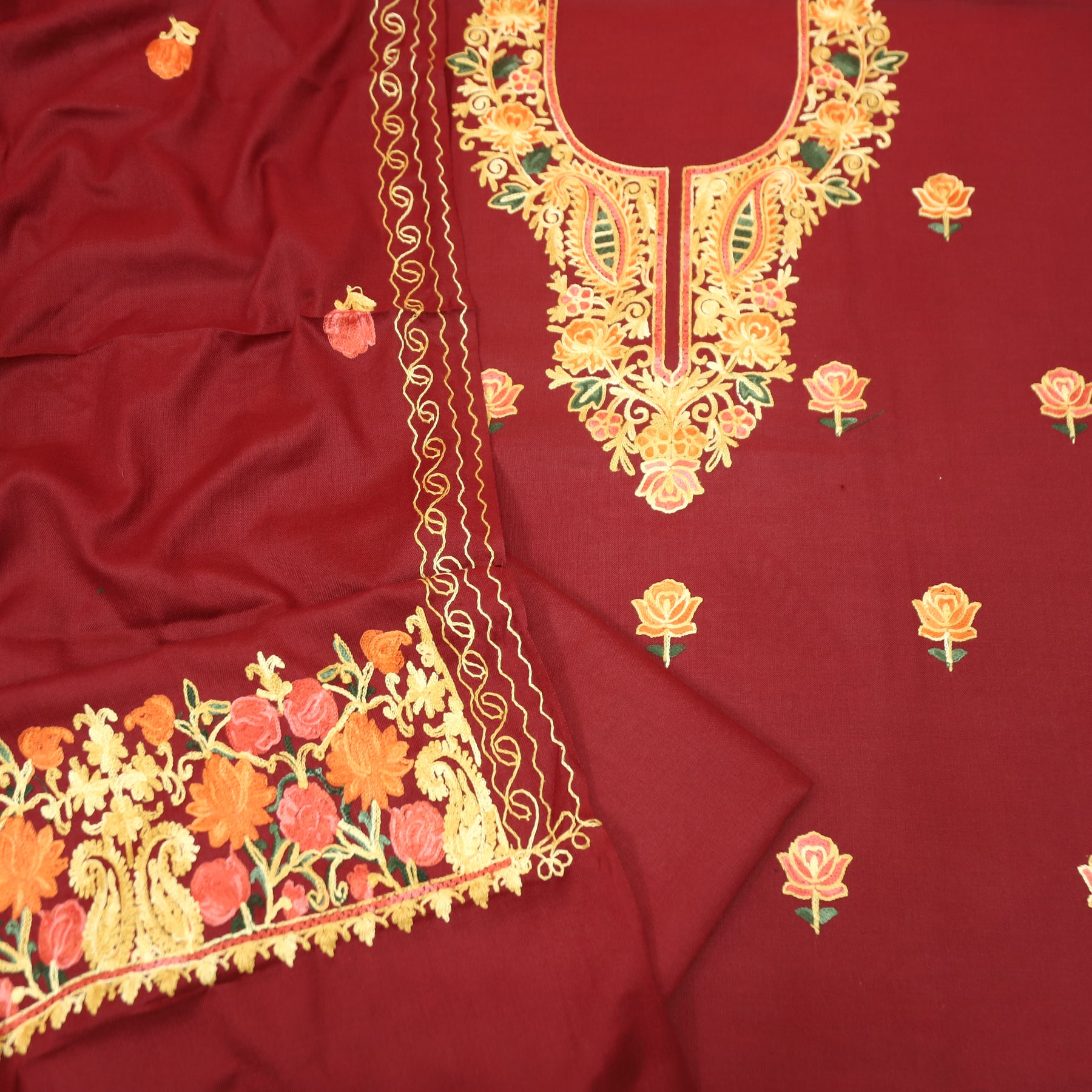 Work - Elevate your winter style with this Semi Pashmina Suit Set, featuring a top beautifully adorned with intricate full Kashida (Kashmiri) embroidery on both the front and back. The rich craftsmanship reflects timeless Kashmiri artistry, adding elegance and warmth to your look. Paired with a matching semi pashmina dupatta highlighted by delicate embroidered detailing along the hem, this ensemble exudes refined grace and comfort — perfect for festive and winter occasions.
