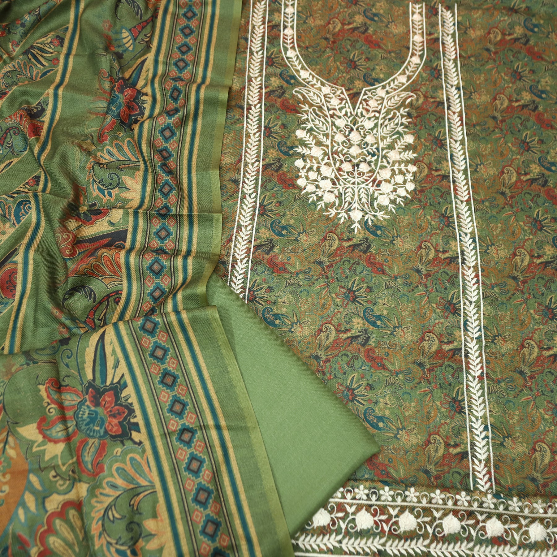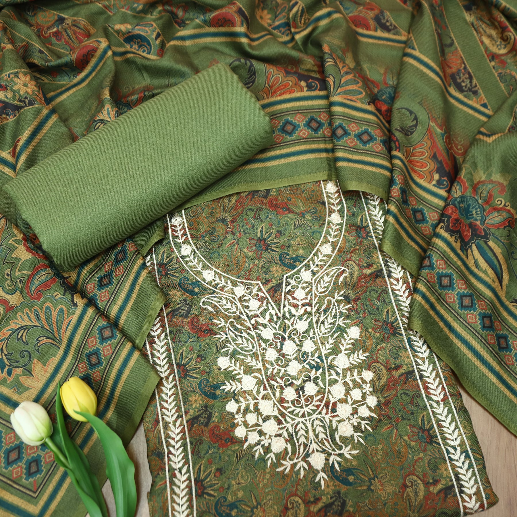 रिया Sage Green Kanni Printed with Panel Embroidered Work Semi Pashmina Winter Set