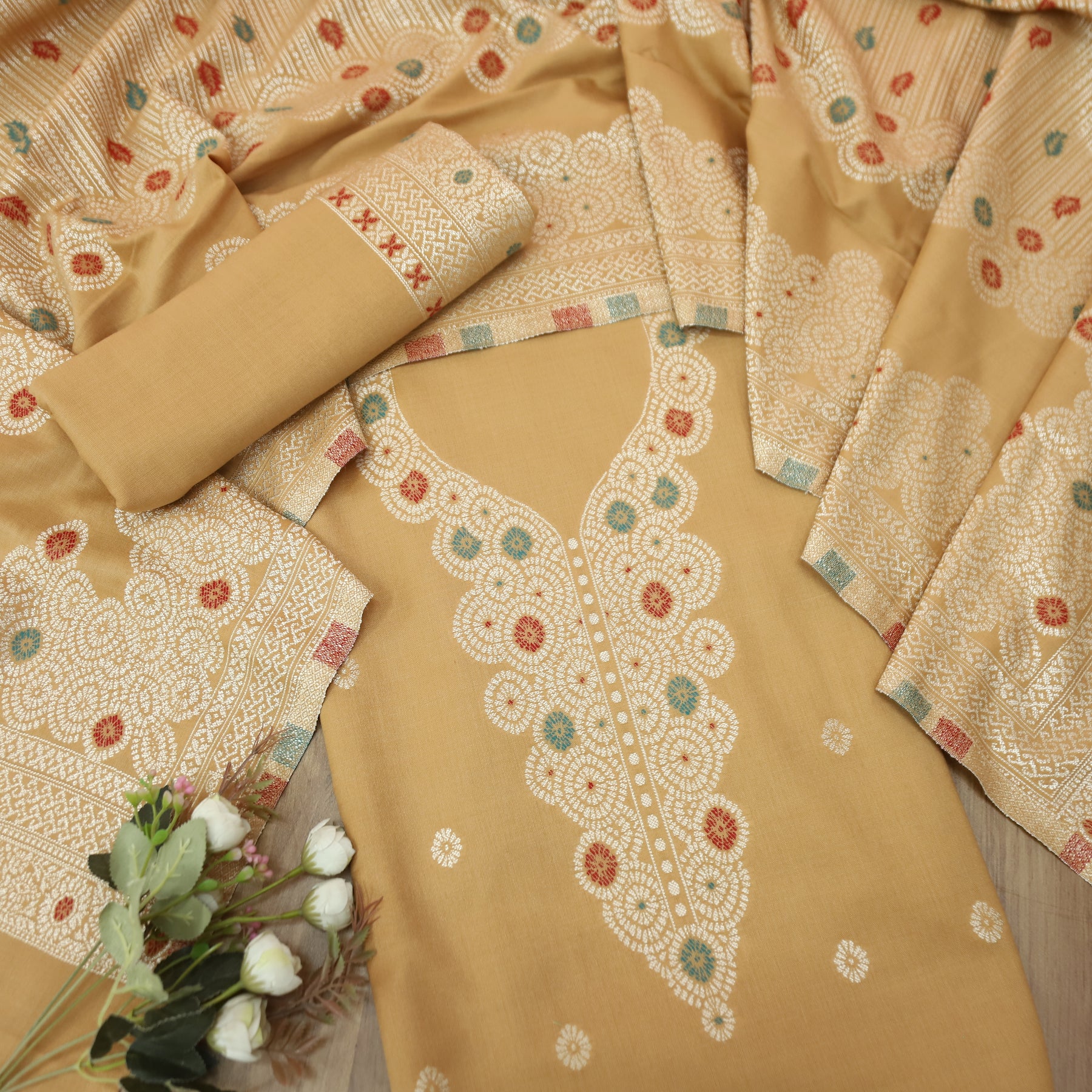 Work-This semi-pashmina suit set features delicate thread and zari embroidery beautifully crafted on the neckline and hem, complemented by a matching dupatta adorned with the same intricate detailing. A graceful ensemble that blends subtle shimmer with timeless elegance.