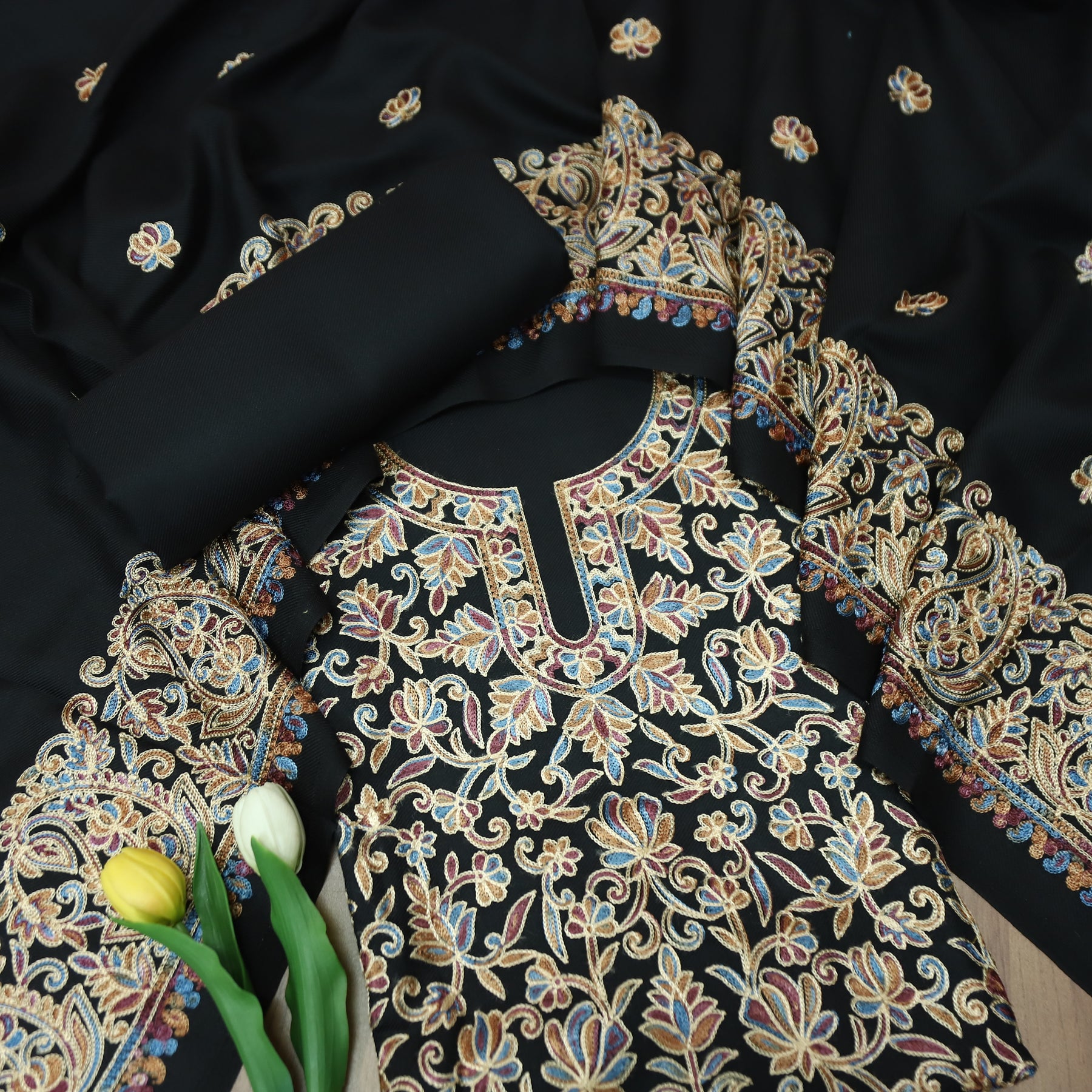 रूपवती Night Black Elegant Woven Kashida Embroidery Semi Pashmina Winter Set