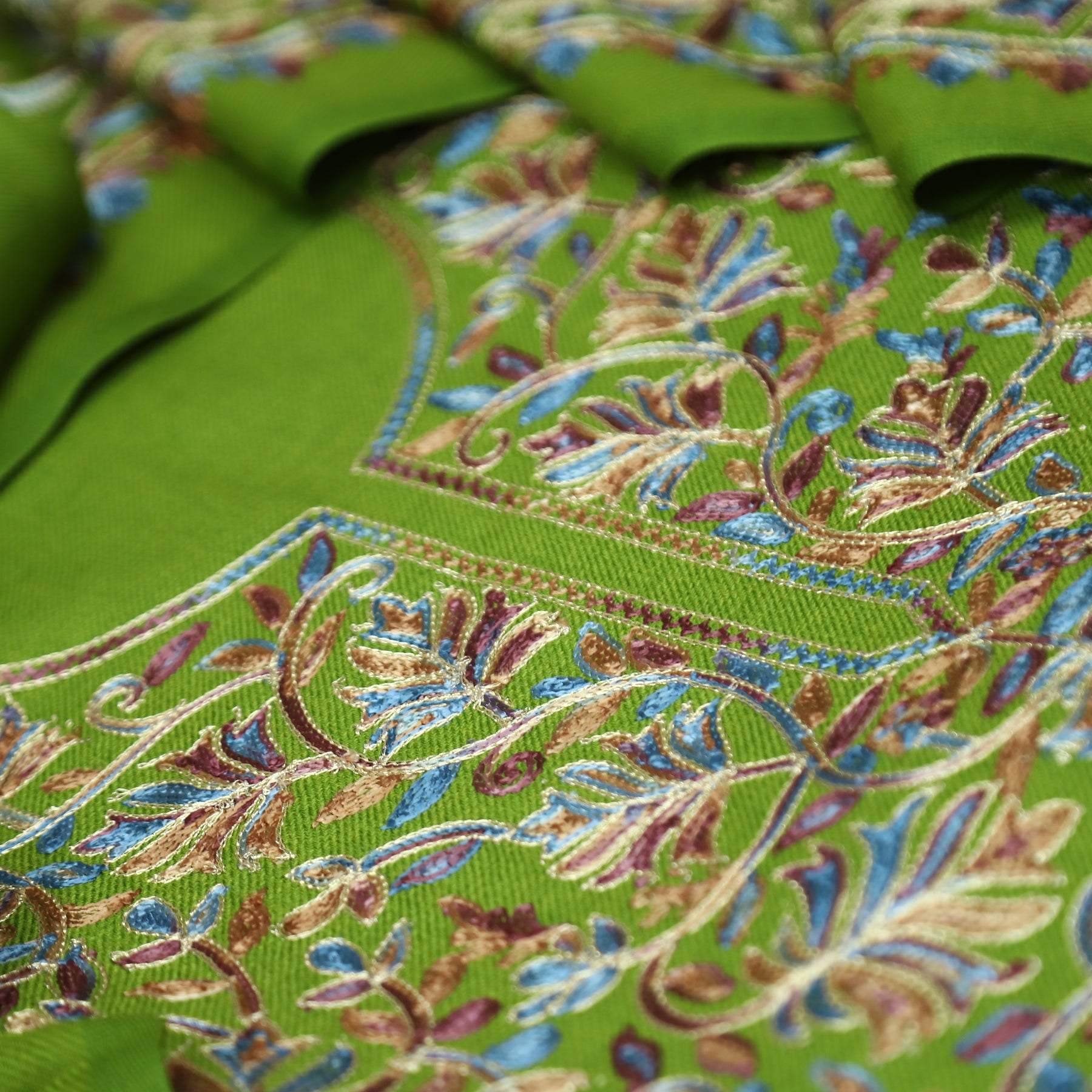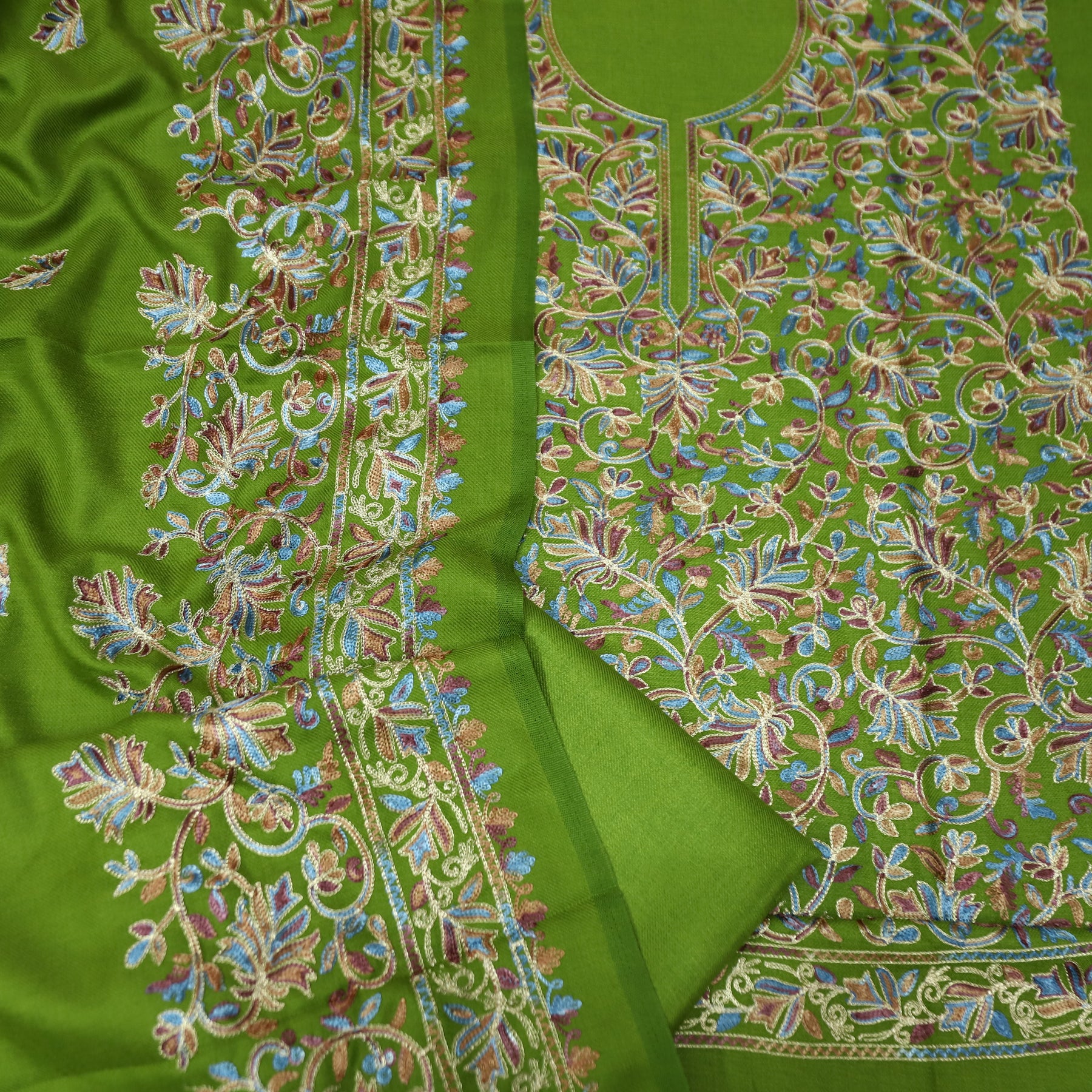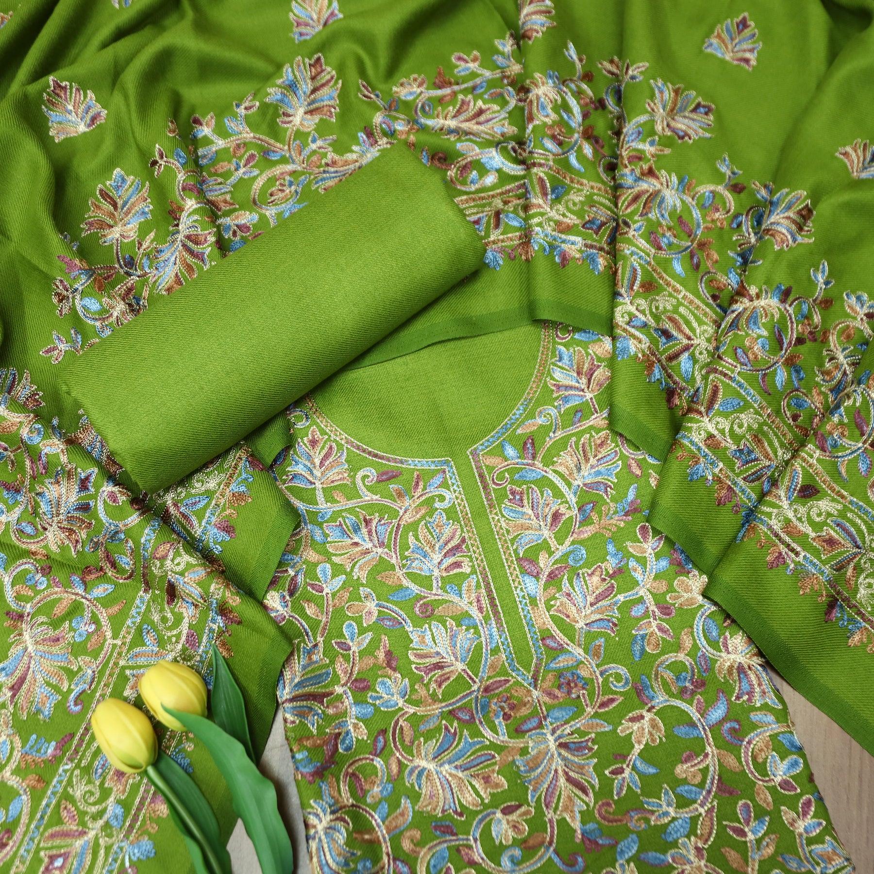 रूपवती Parrot Green Elegant Woven Kashida Embroidery Semi Pashmina Winter Set