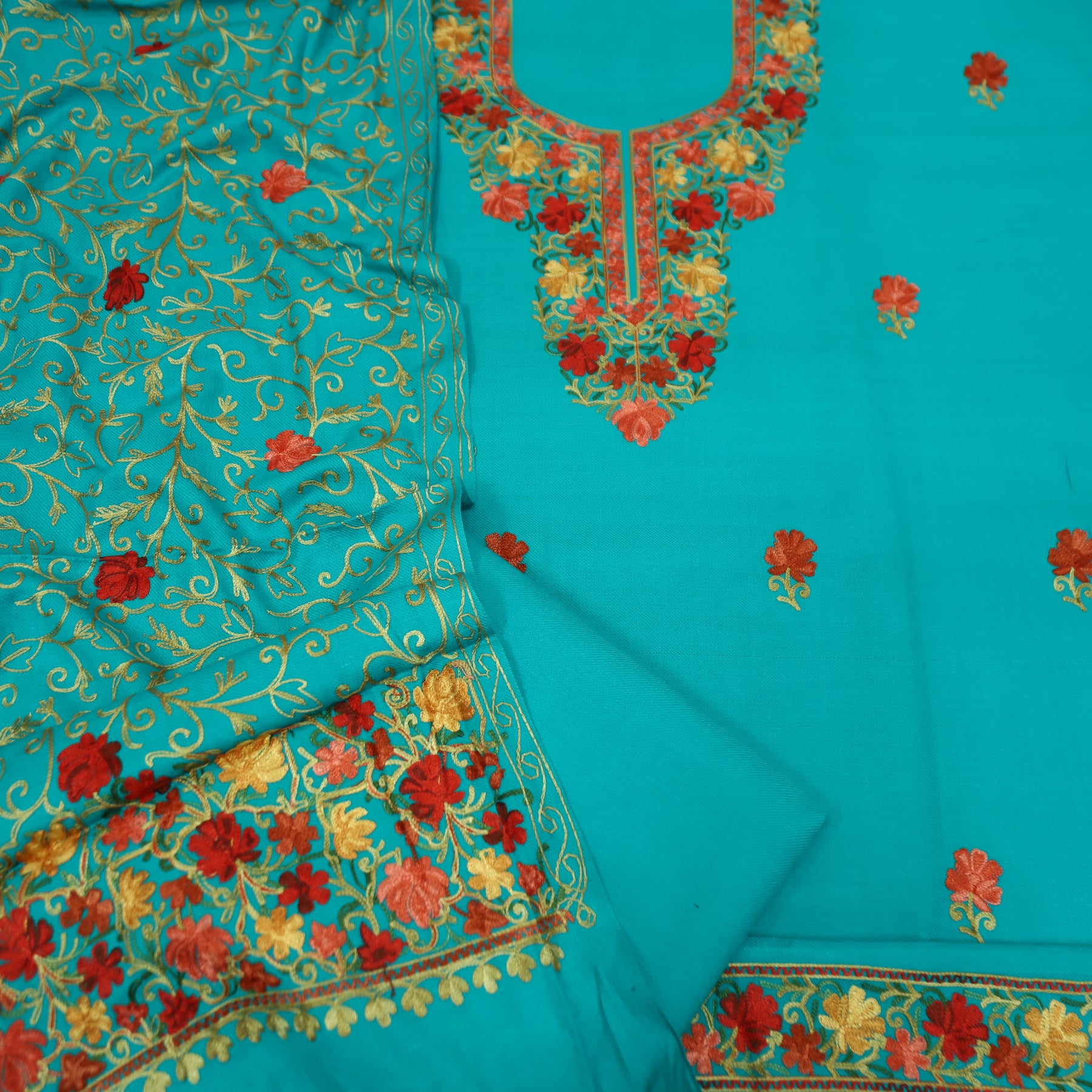 Work - Elevate your winter style with this Semi Pashmina Suit Set, featuring a top beautifully adorned with intricate full Kashida (Kashmiri) embroidery on both the front and back. The rich craftsmanship reflects timeless Kashmiri artistry, adding elegance and warmth to your look. Paired with a matching semi pashmina dupatta highlighted by delicate embroidered detailing along the hem, this ensemble exudes refined grace and comfort — perfect for festive and winter occasions.