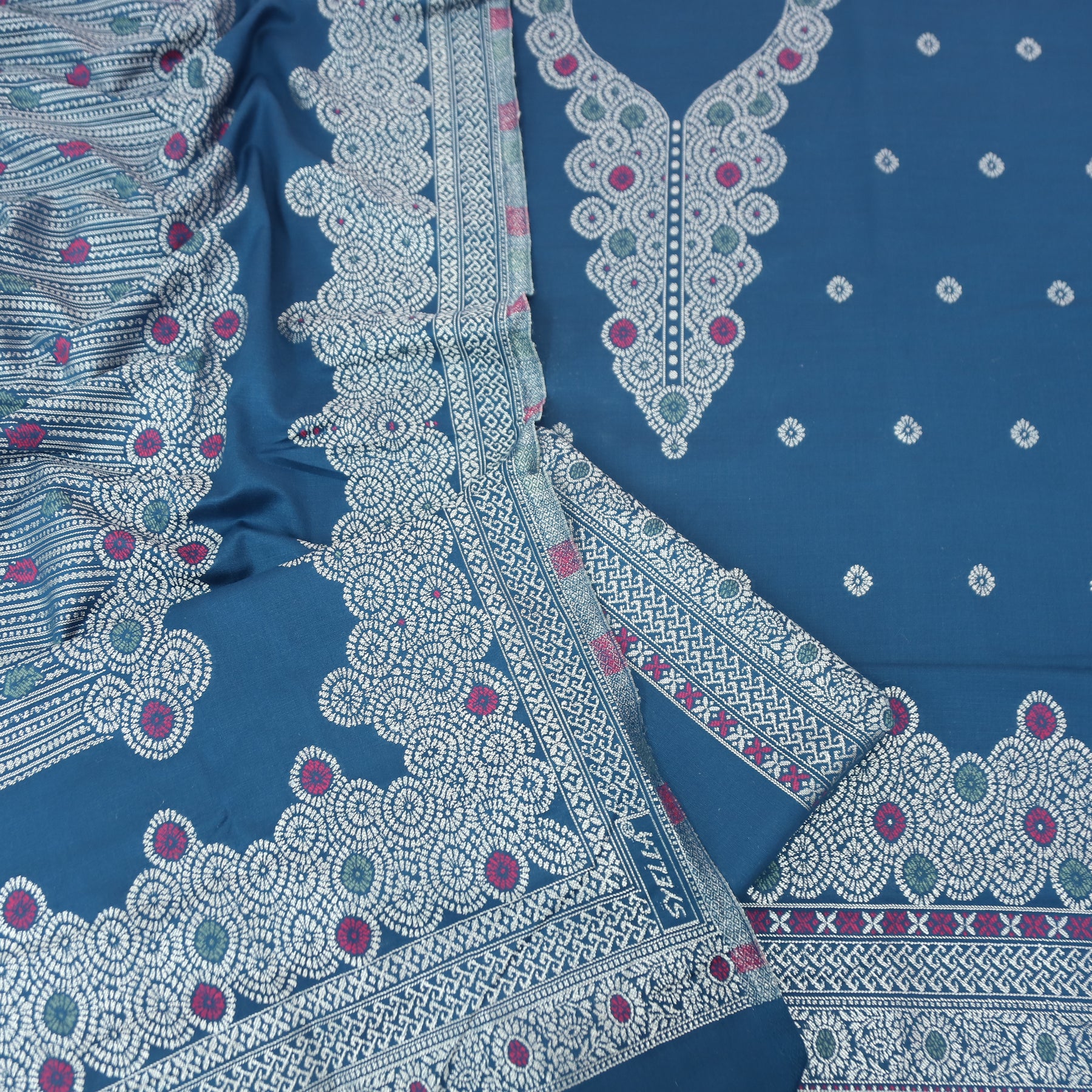 Work-This semi-pashmina suit set features delicate thread and zari embroidery beautifully crafted on the neckline and hem, complemented by a matching dupatta adorned with the same intricate detailing. A graceful ensemble that blends subtle shimmer with timeless elegance.