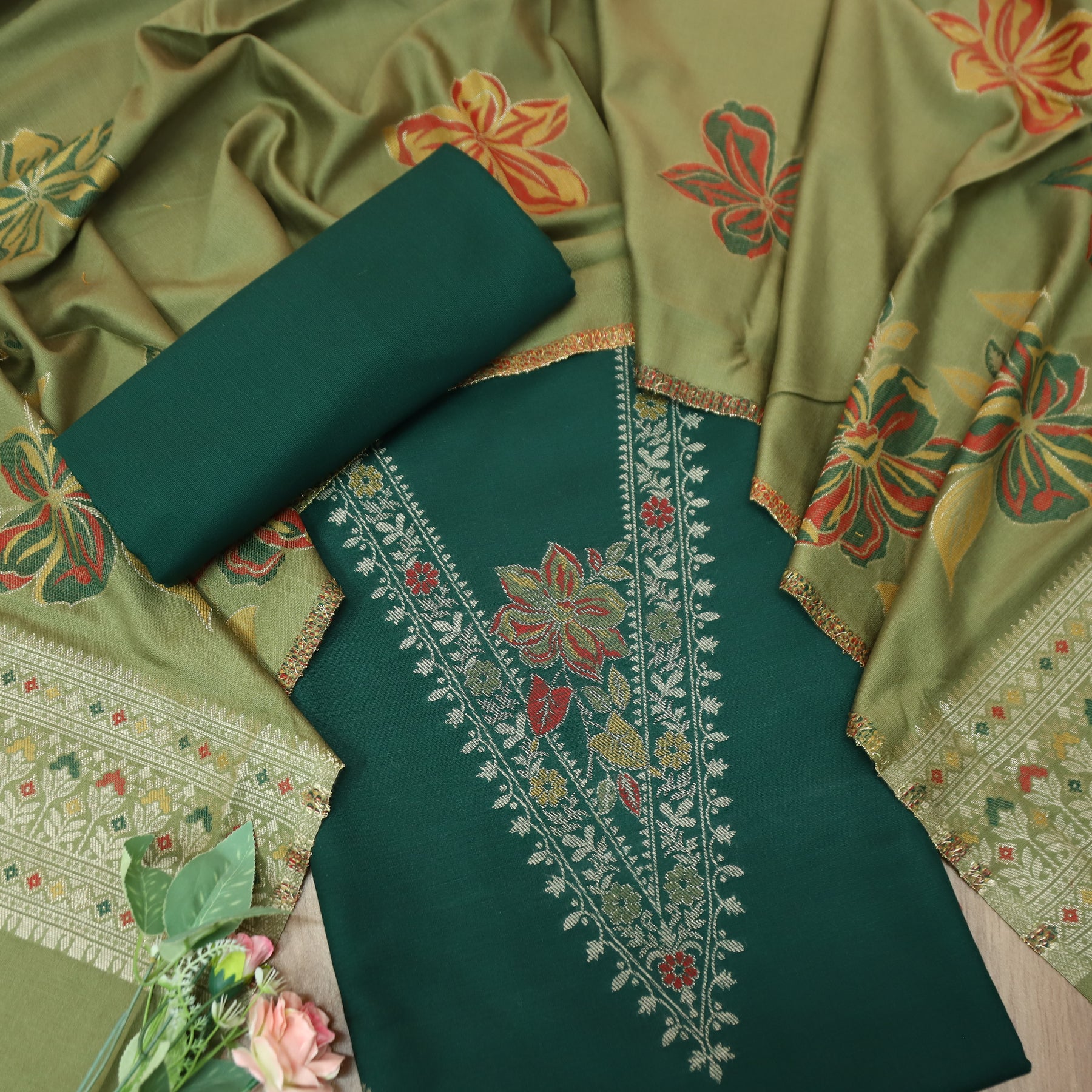 सिलसिला Dark Green Thread with Zari Neck Work Semi Pashmina Winter Suit Set