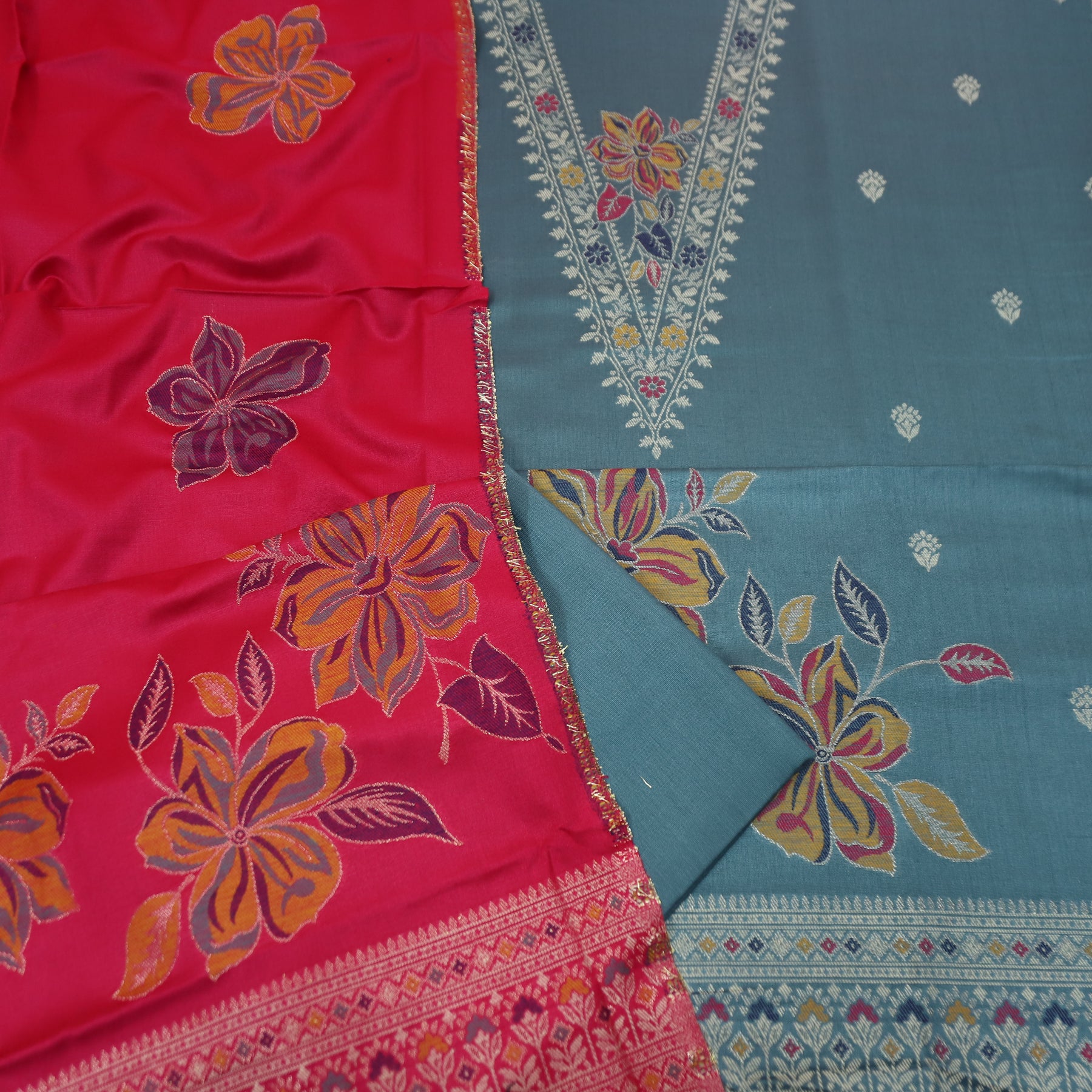 Work- A rich semi pashmina top beautifully enhanced with woven geometric motifs along the neckline and hem, exuding traditional artistry with a modern touch. Paired with a vibrant turquoise semi pashmina dupatta featuring all-over ethnic-inspired weaving, this ensemble strikes the perfect balance between color and craftsmanship. The soft, warm texture of semi pashmina ensures comfort during the winter season while maintaining an effortlessly elegant appeal.