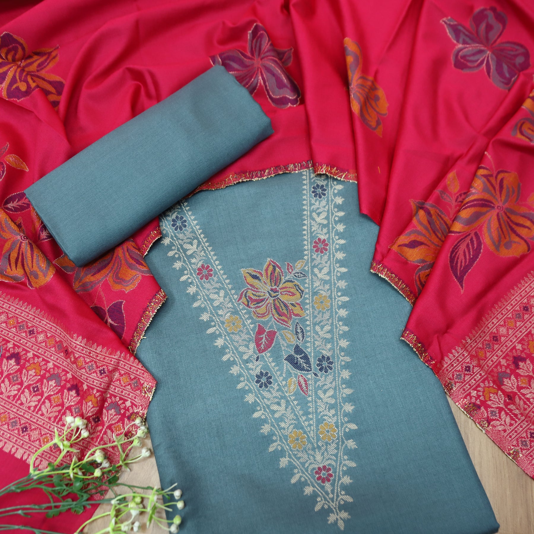 सिलसिला Chorme Grey Thread with Zari Neck Work Semi Pashmina Winter Suit Set