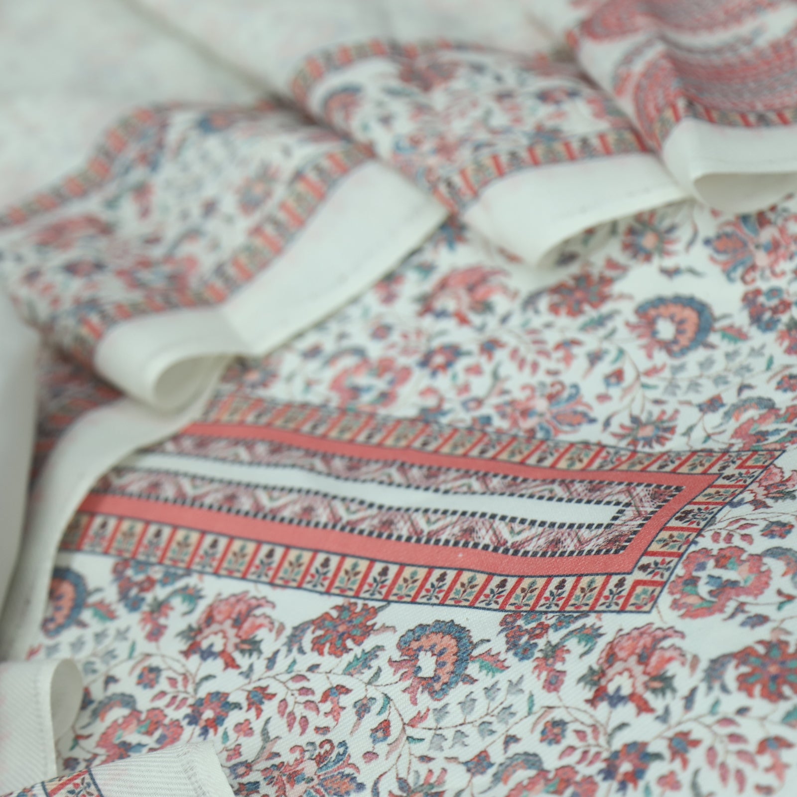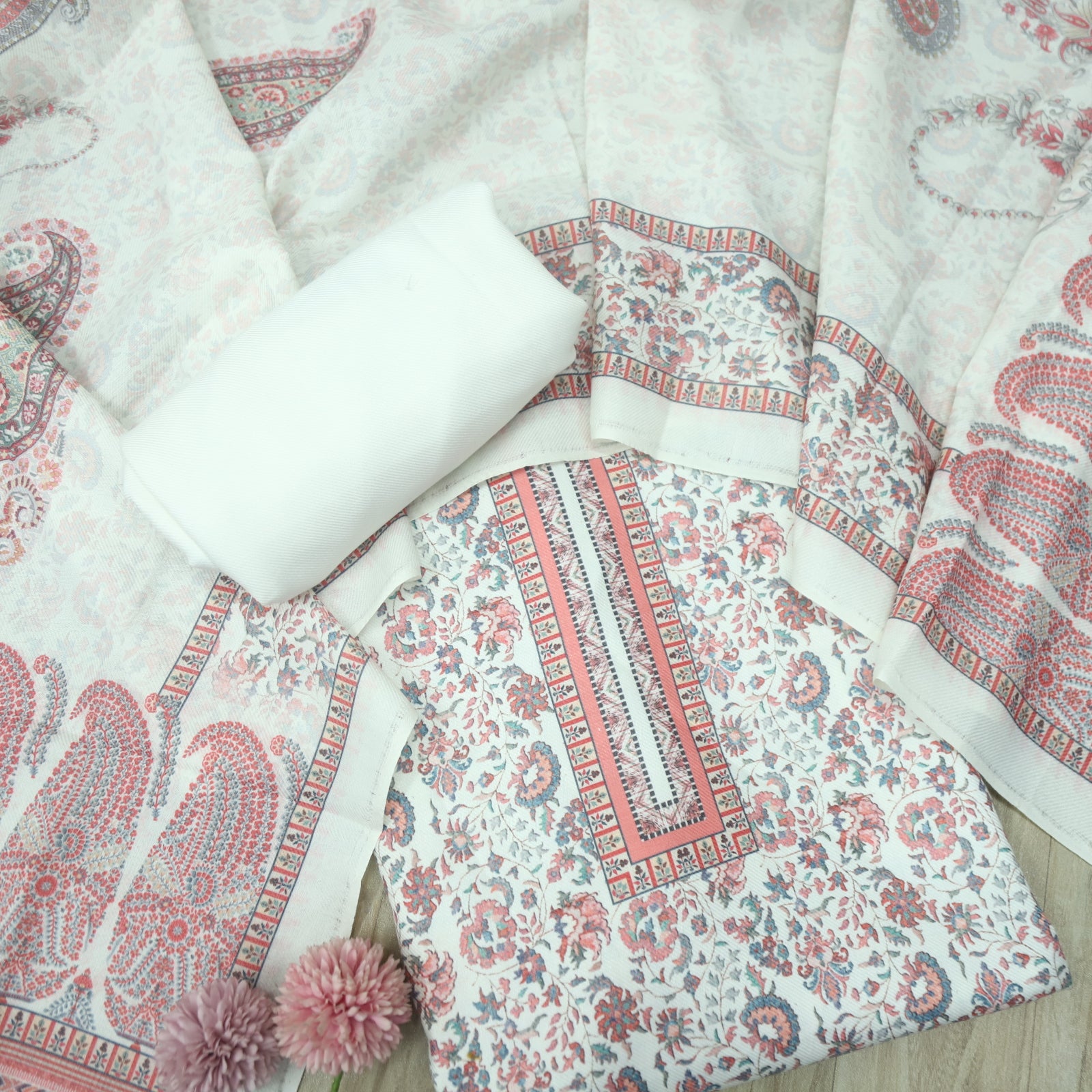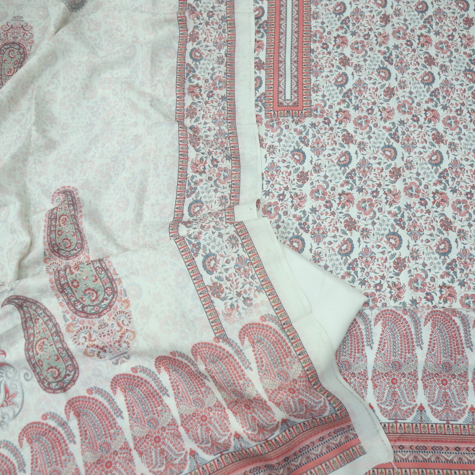 सुप्रिया Cream White Floral Kanni Printed Semi Pashmina Winter Suit Set D4