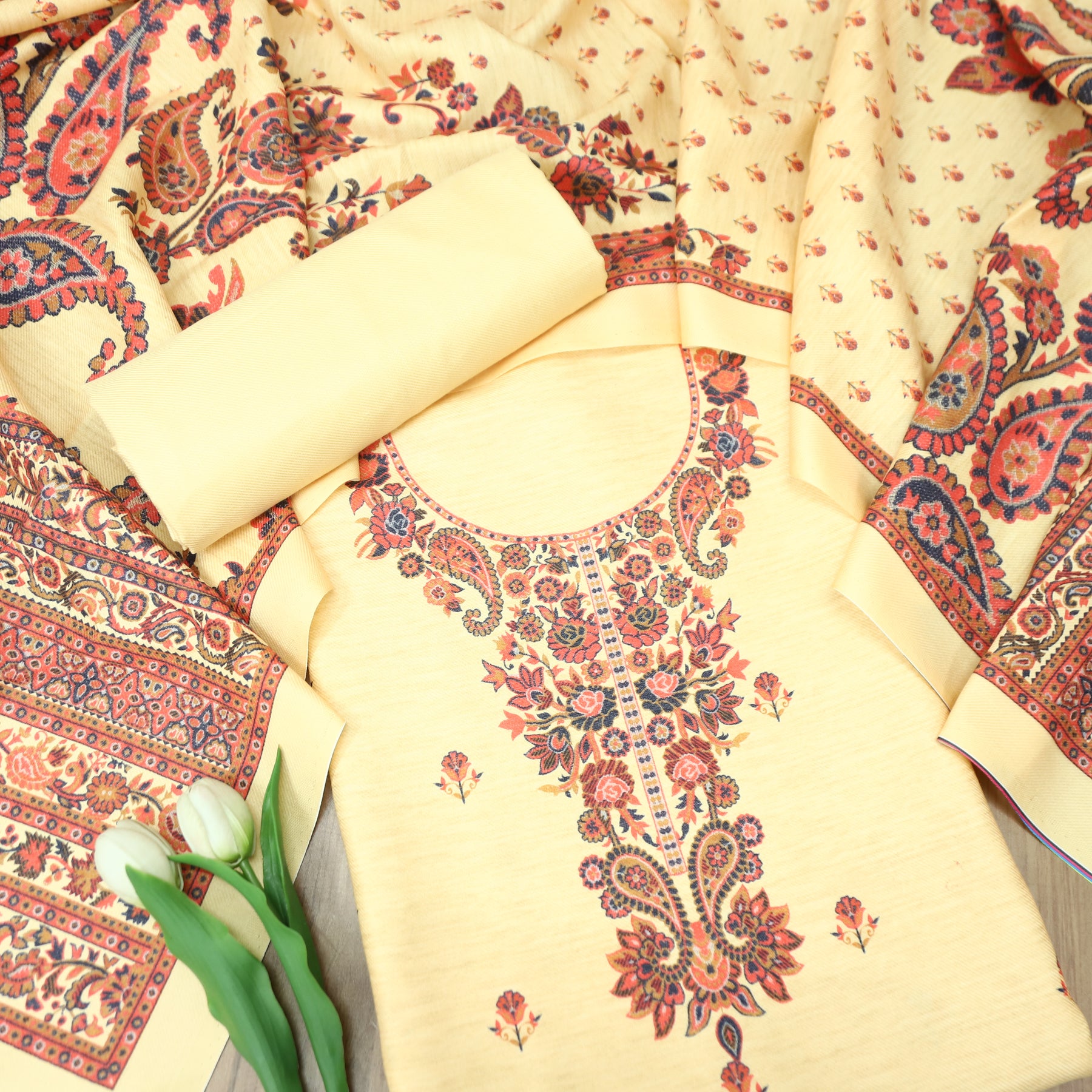 Work- Semi Pashmina Suit Set An elegant semi pashmina suit set adorned with kashmiri-inspired digital floral prints on the kurta, creating a rich and graceful appeal. Paired with a beautifully coordinated printed dupatta, this ensemble offers a perfect blend of warmth, softness, and timeless elegance—ideal for winter festivities and everyday sophistication..