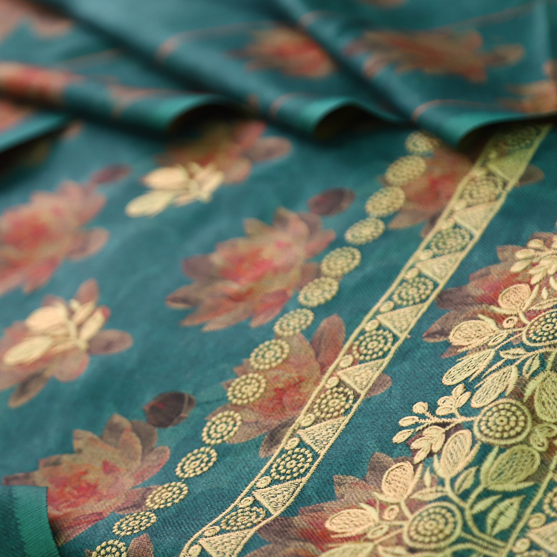 जस्सी Emerald Green Floral Print in Embroidered Work Semi Pashmina Winter Set