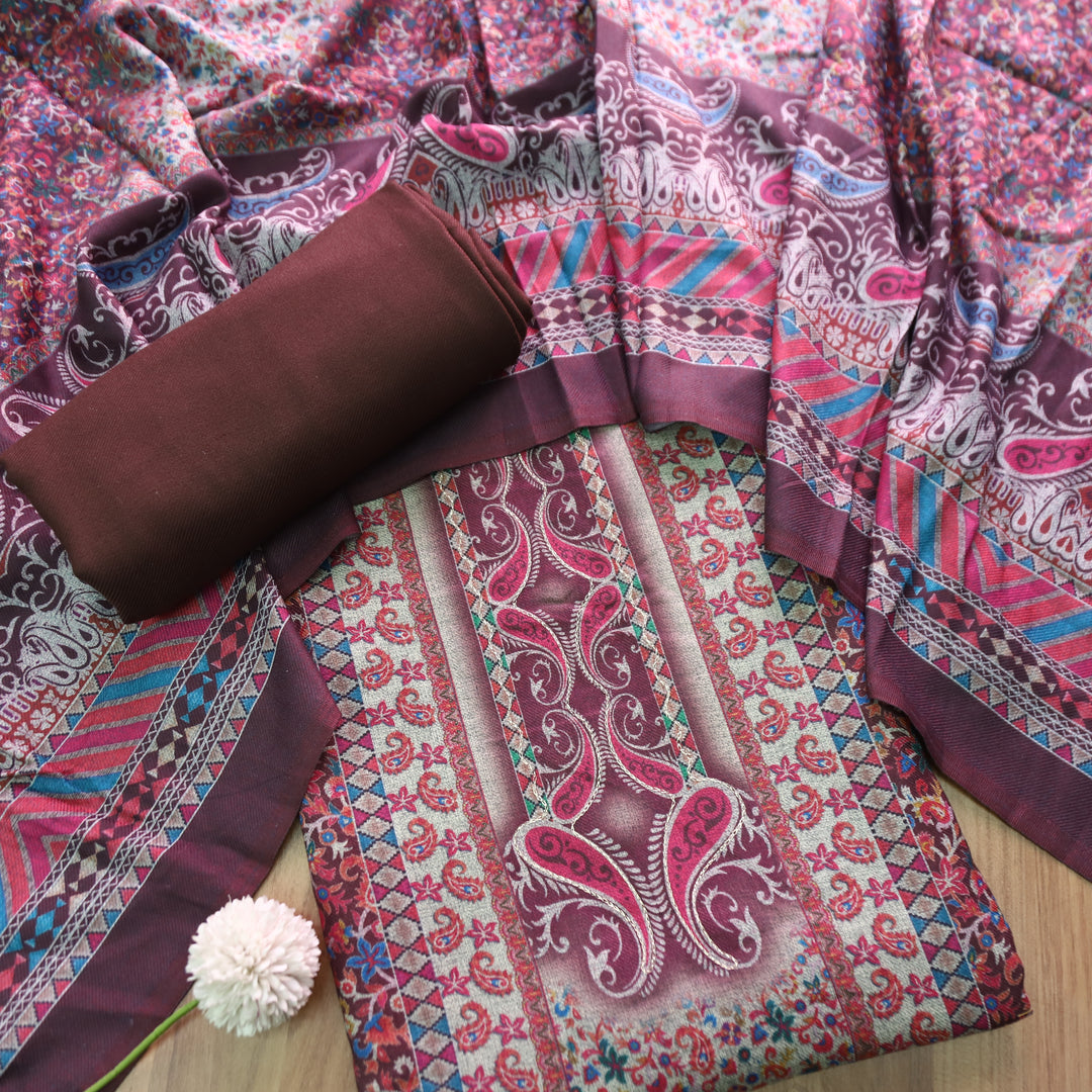 Farida Wine Burgundy Digital Print Semi Pashmina Winter Suit Set