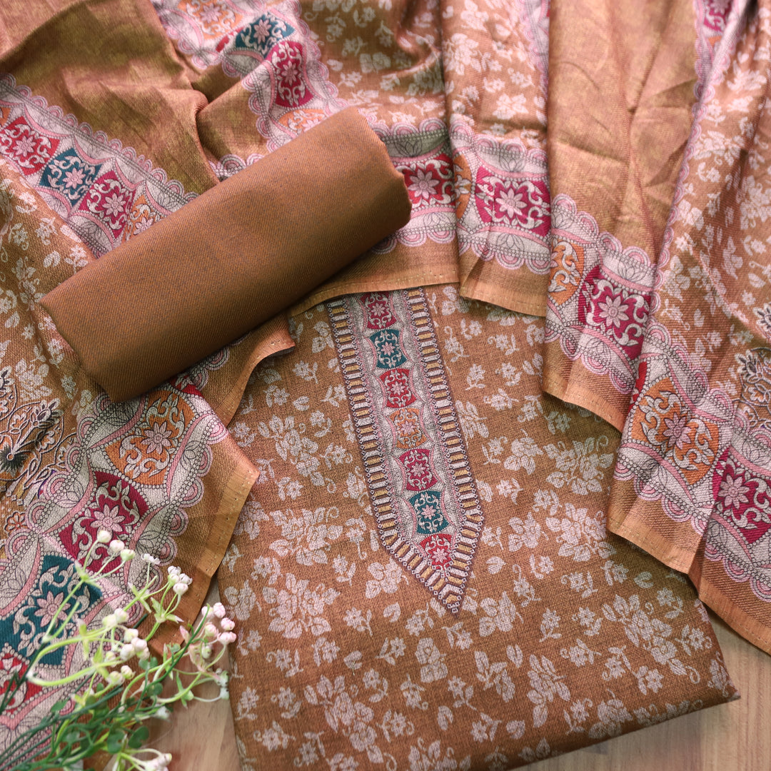 Farida Deep Chocolate Brown Digital Print Semi Pashmina Winter Suit Set