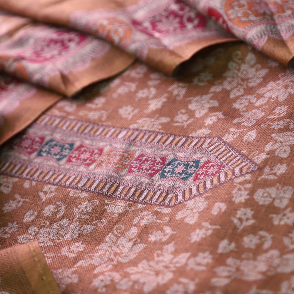 फरीदा Caramel Brown Panel Style Printed with Swarovski Semi Pashmina Winter Set