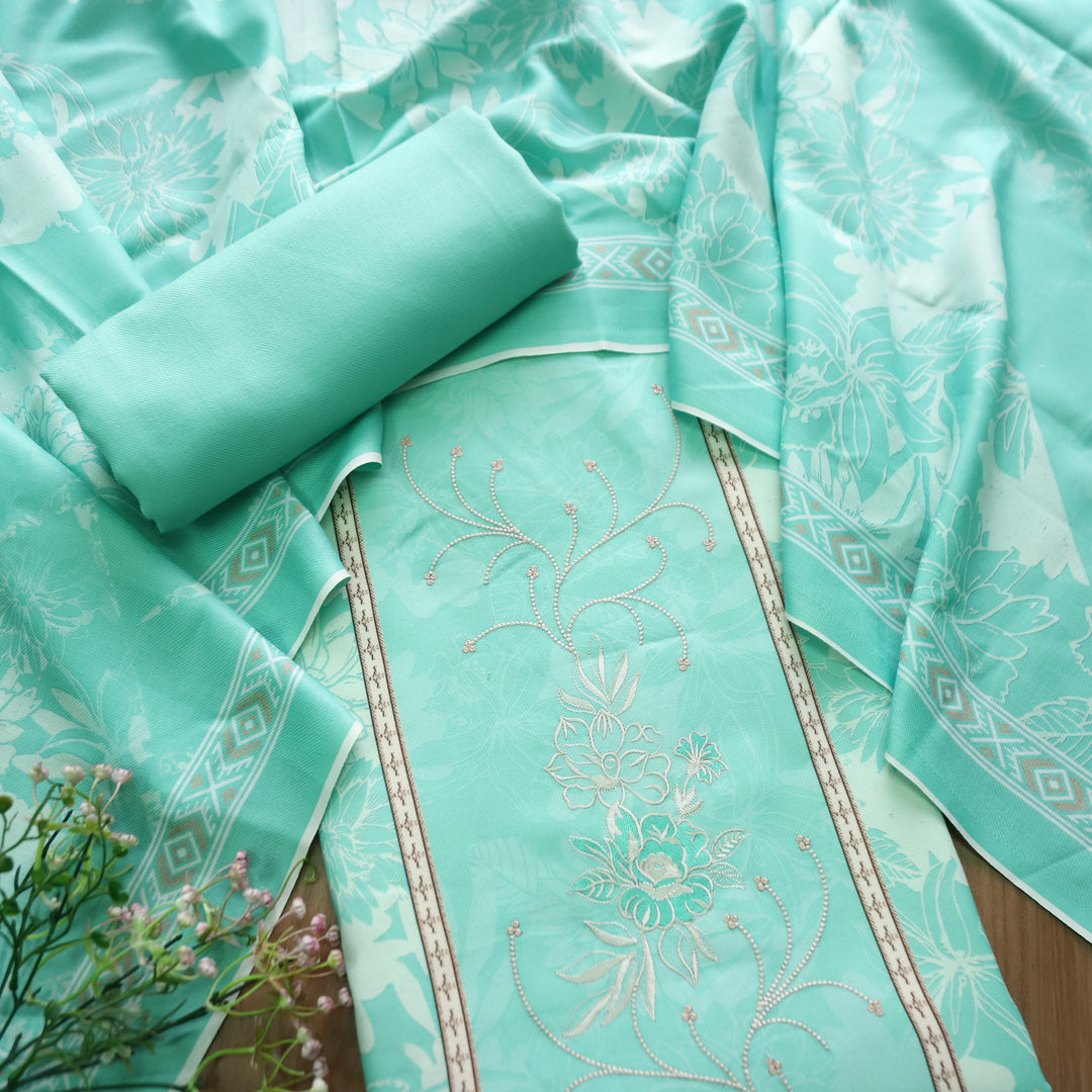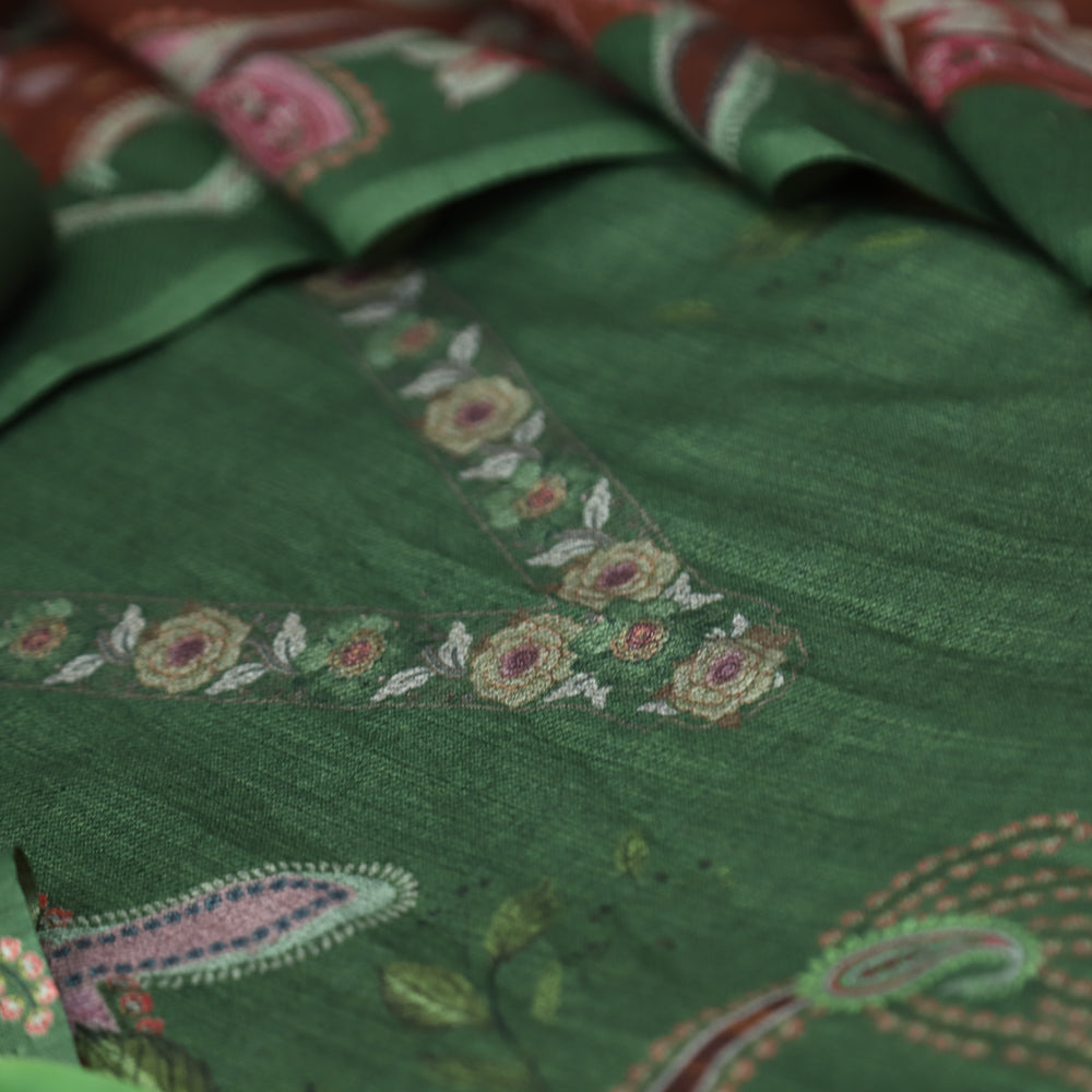 Garj Grass Green Patra Detailing in Digital Printed Semi Pashmina Winter Suit Set