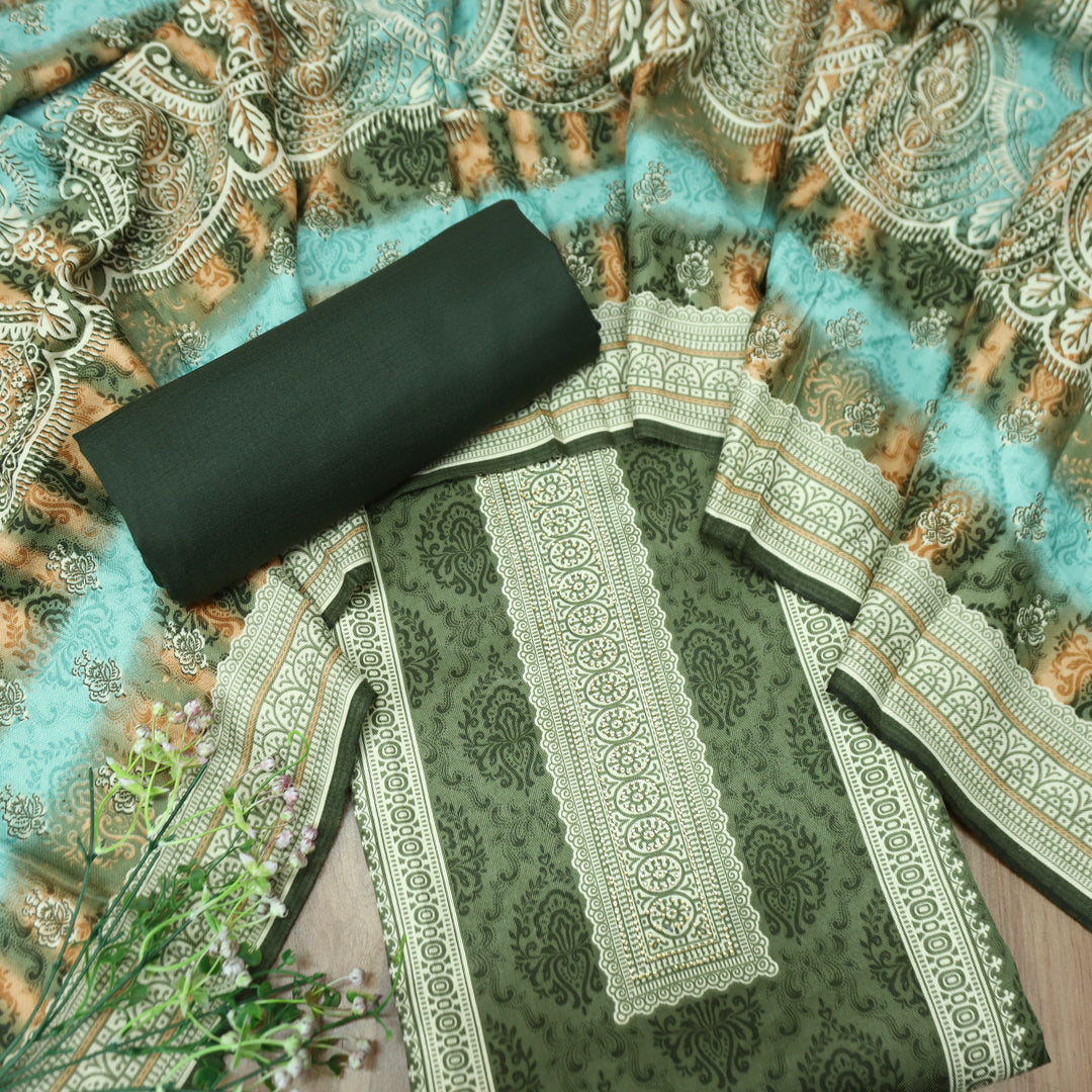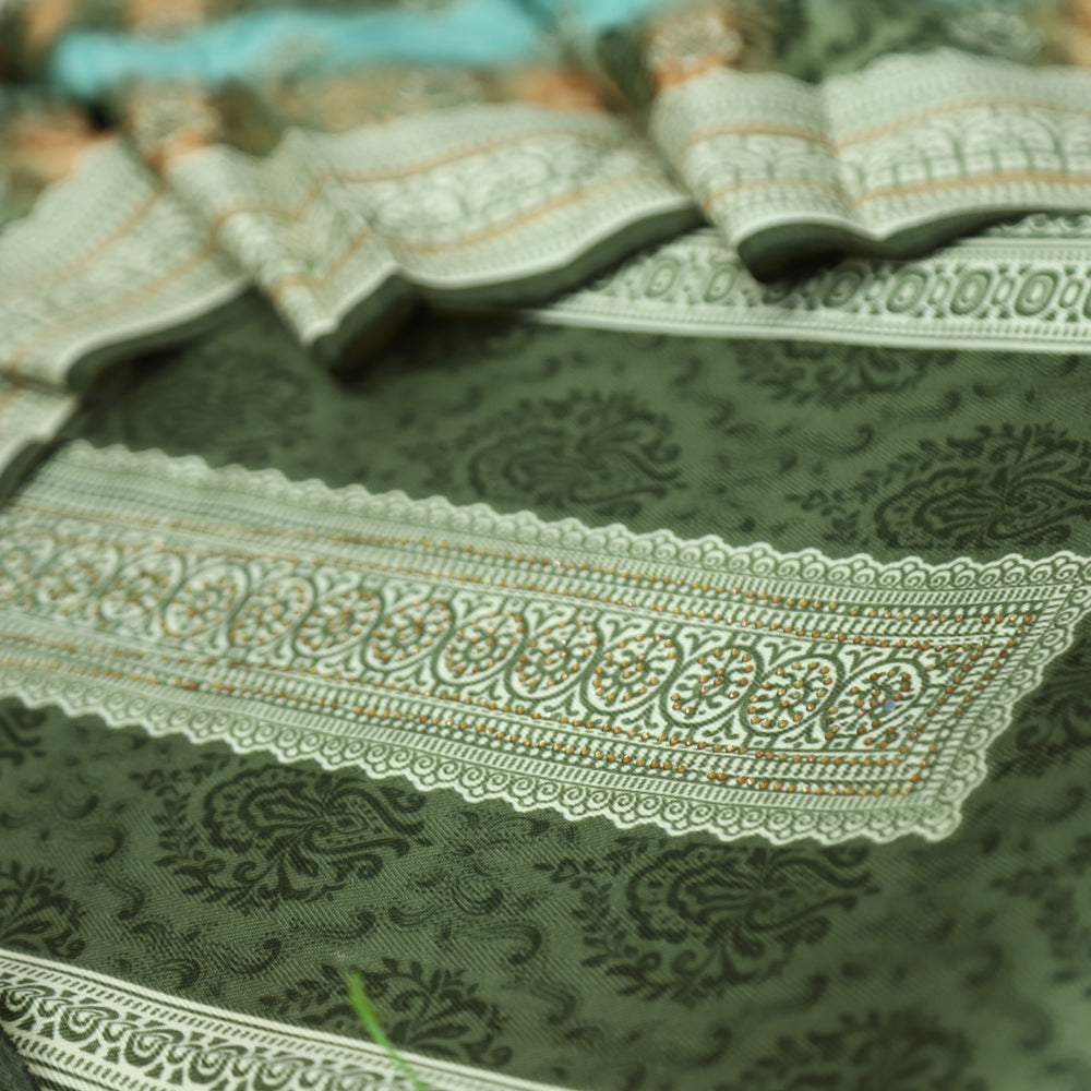 फरीदा Olive Green Panel Style Printed with Swarovski Semi Pashmina Winter Set