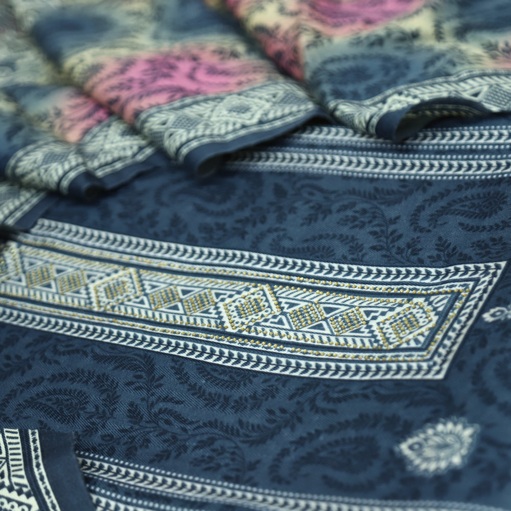 फरीदा Navy Dark Blue Panel Style Printed with Swarovski Semi Pashmina Winter Set