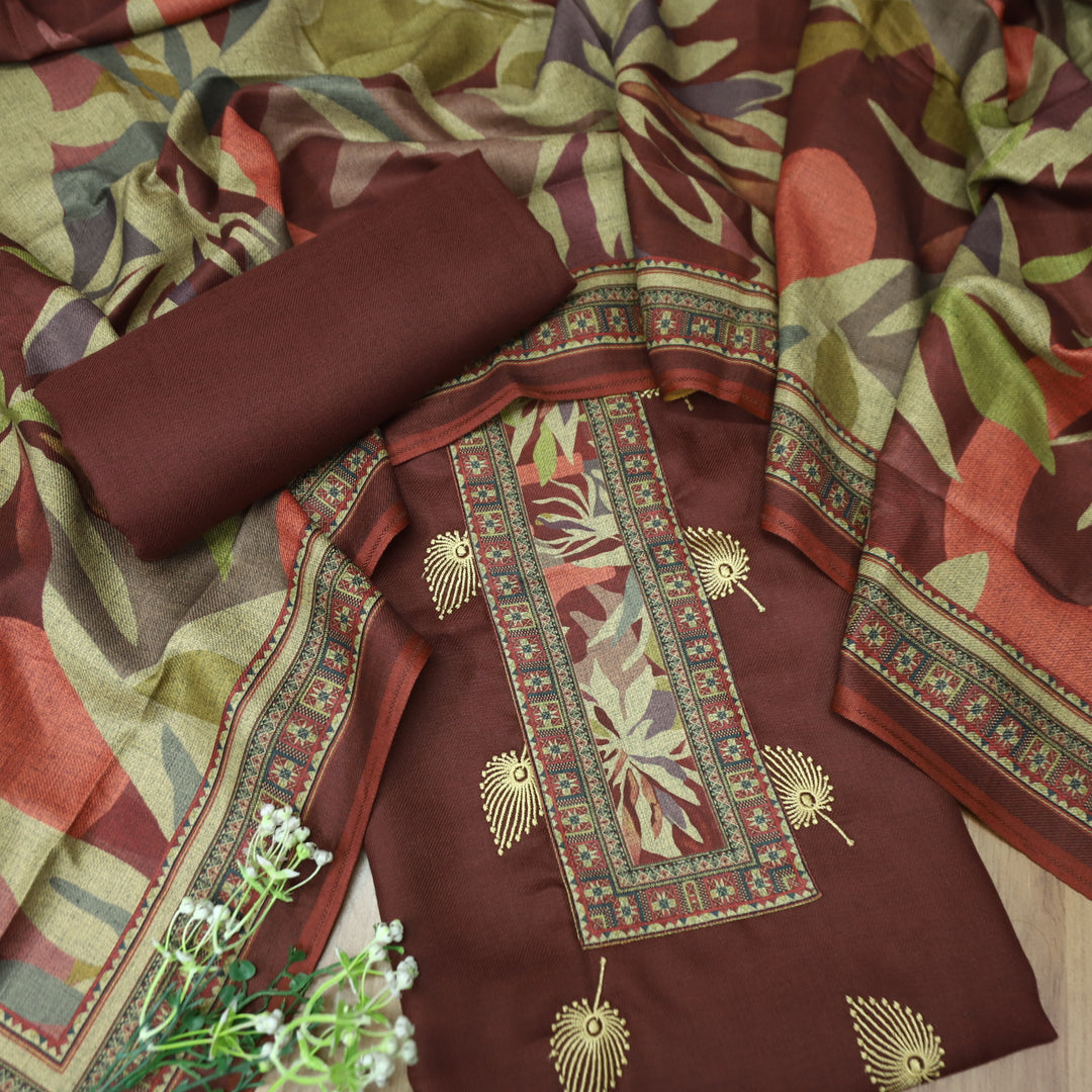 सुन्दरी Choco Brown Digital Print Patch Neck with Thread Work Semi Pashmina Winter Set