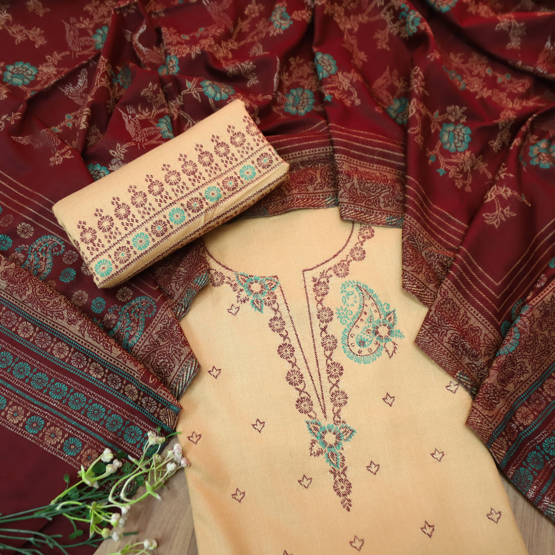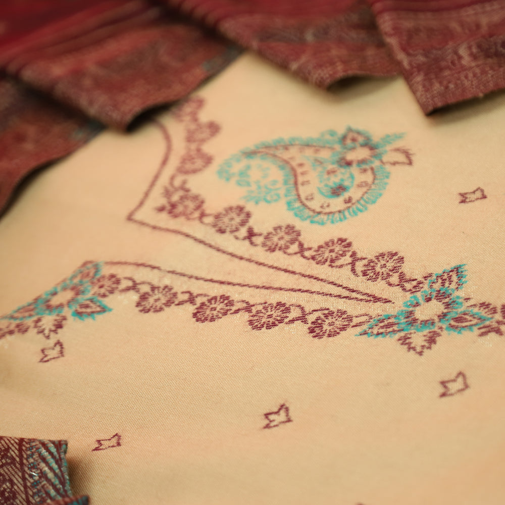 परशक्ति Maroon Red Elegant Woven Kashida Embroidery Semi Pashmina Winter Set