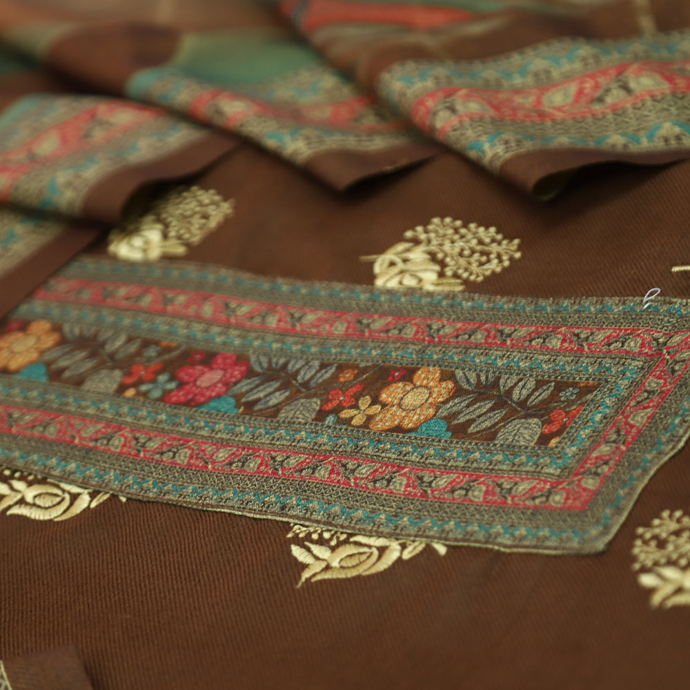 द्रौपदी Coffee Brown Floral Print in Floral Embroidery Work Semi Pashmina Winter Set