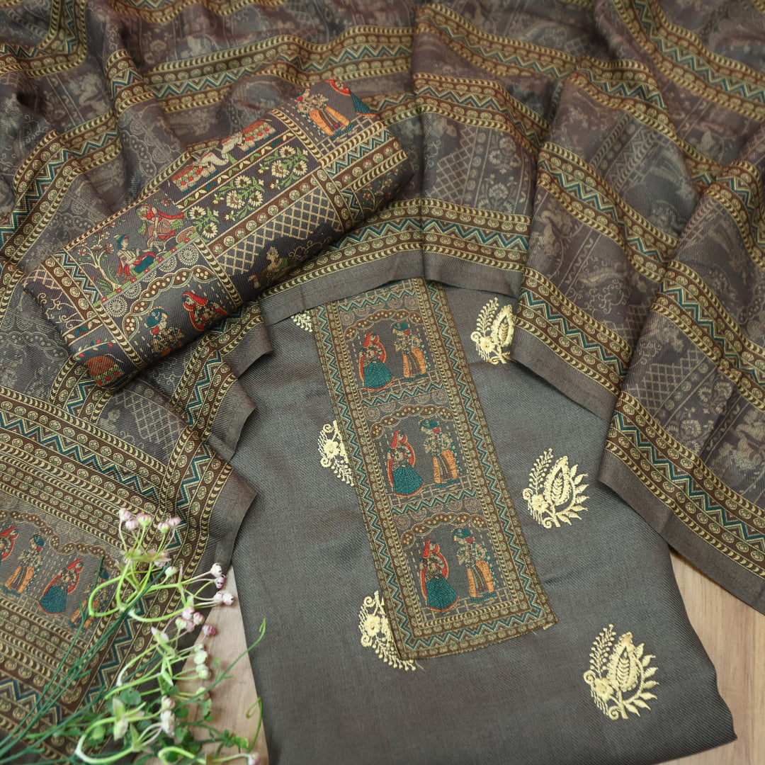 इशानी Dark Mahogany Grey All Over Zari Weaved in Semi Pashmina Winter Suit Set