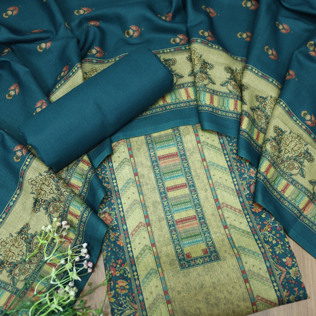 परशक्ति Dark Green Elegant Woven Kashida Embroidery Semi Pashmina Winter Set