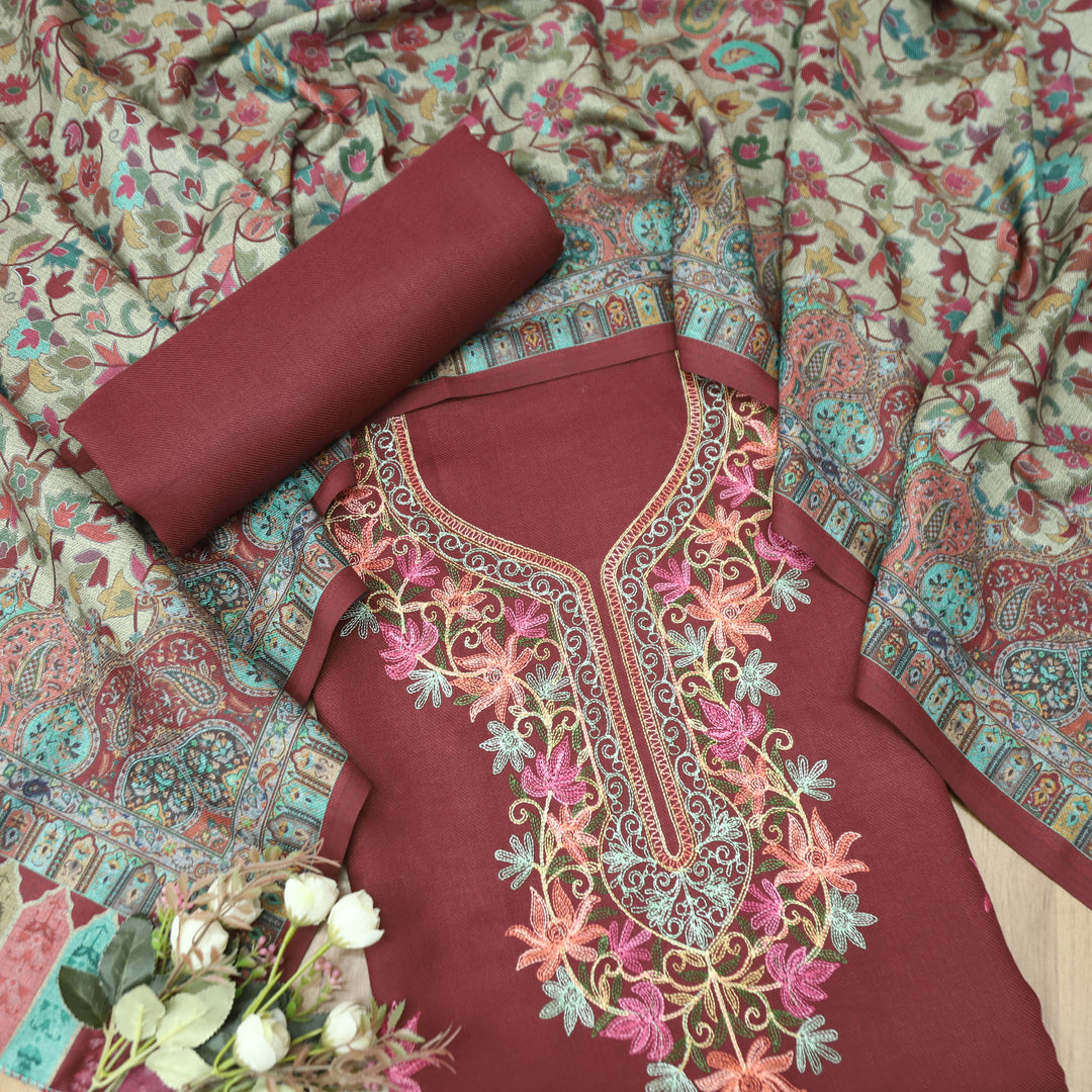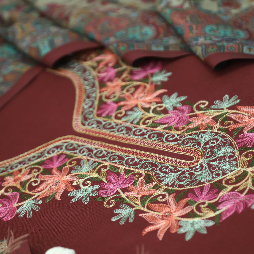 रुचिका Mahogany Red with Colorful Kashida Embroidery Work Semi Pashmina Winter Set