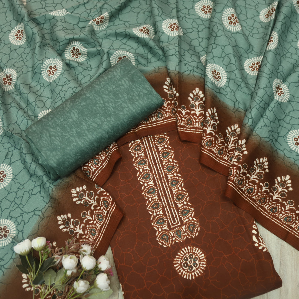Farida Sac. Green Brown Digital Print Semi Pashmina Winter Suit Set