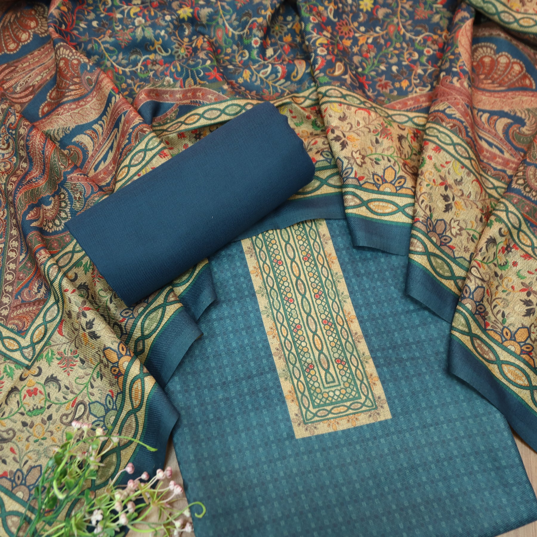 आरती Sapphire Blue Digital Kanni Printed Hem Semi Pashmina Winter Set