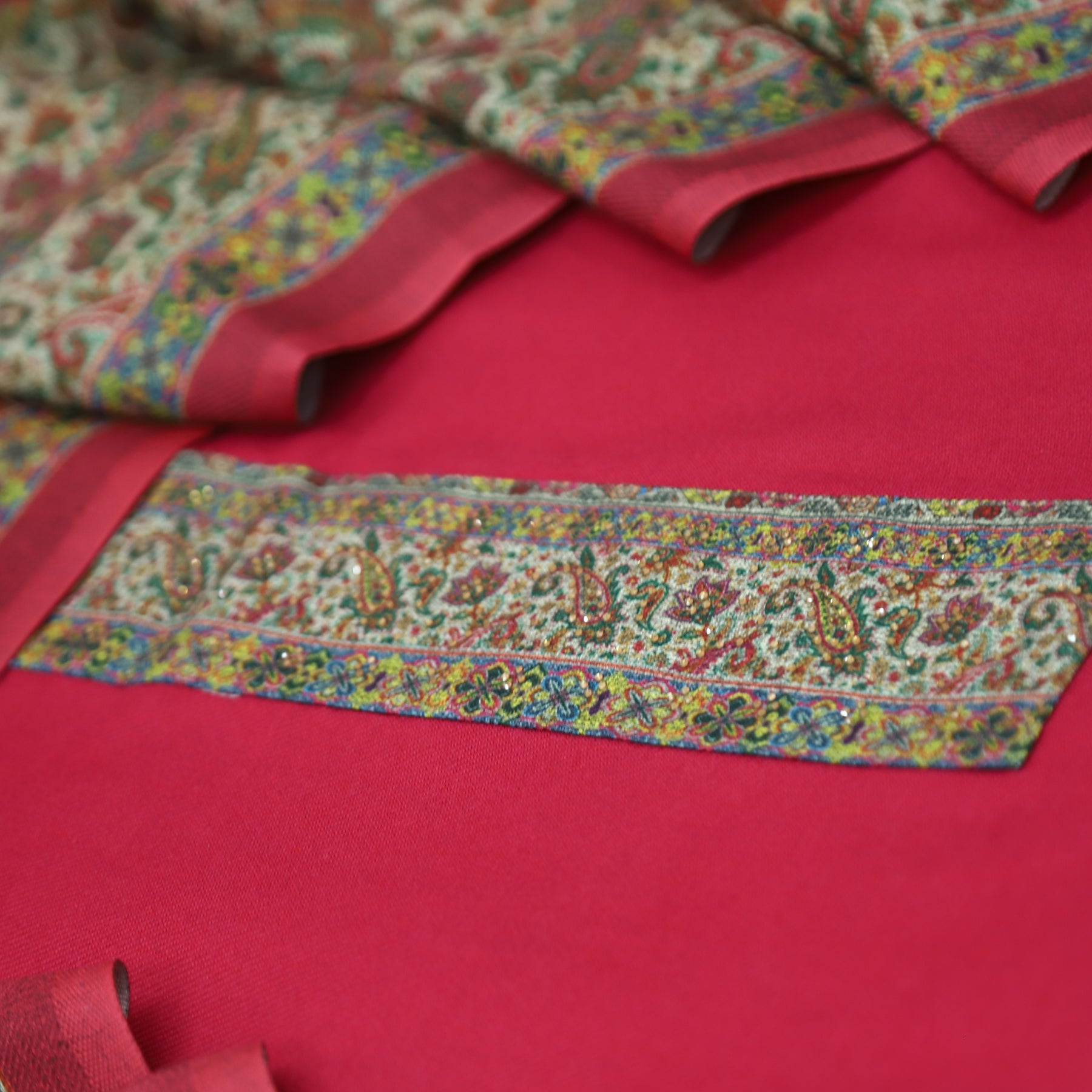 आरुषि Flamingo Pink Intricated Digital Print Hemline in Semi Pashmina Winter Set