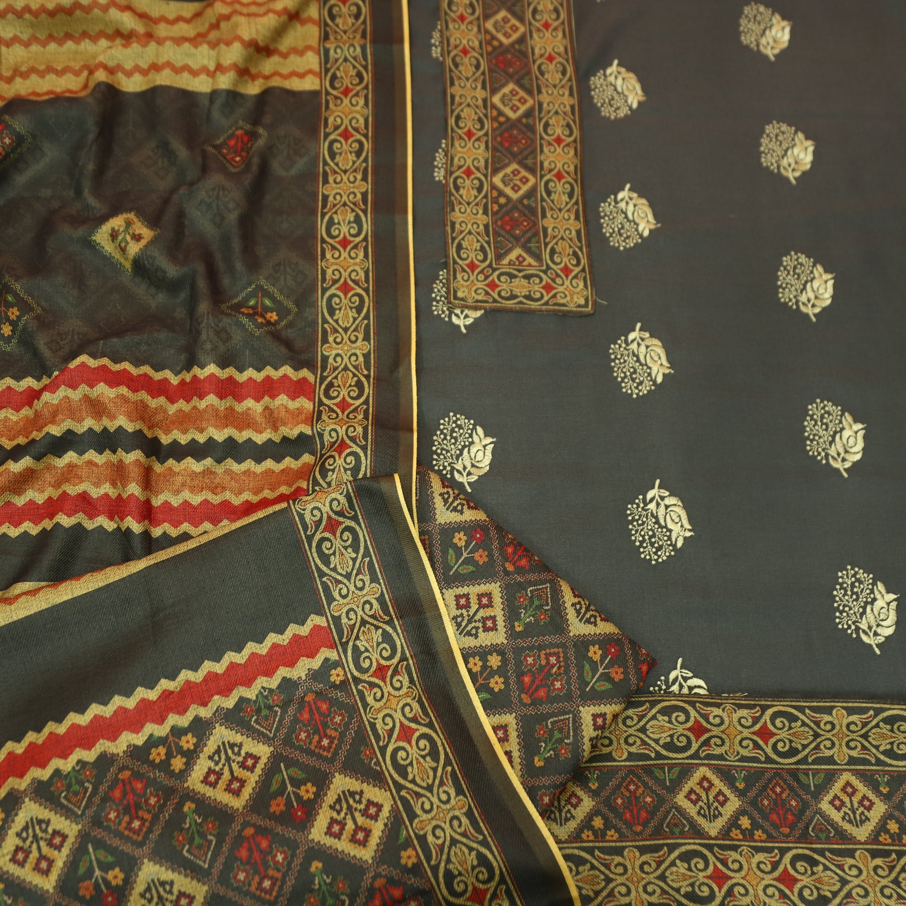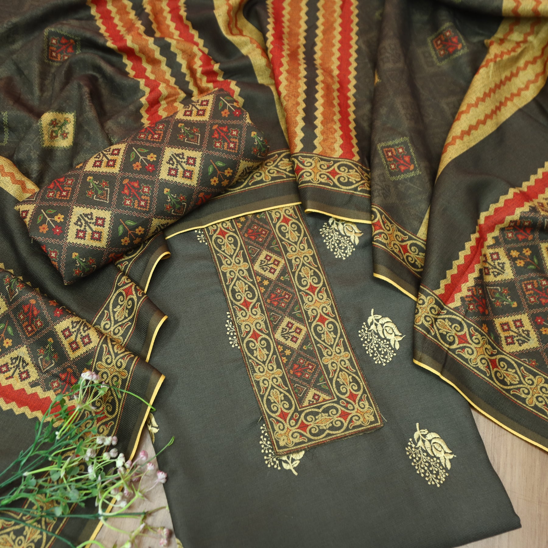 कशिश Charcoal Tan Print Patch in Floral Embroidery Work Semi Pashmina Winter Set