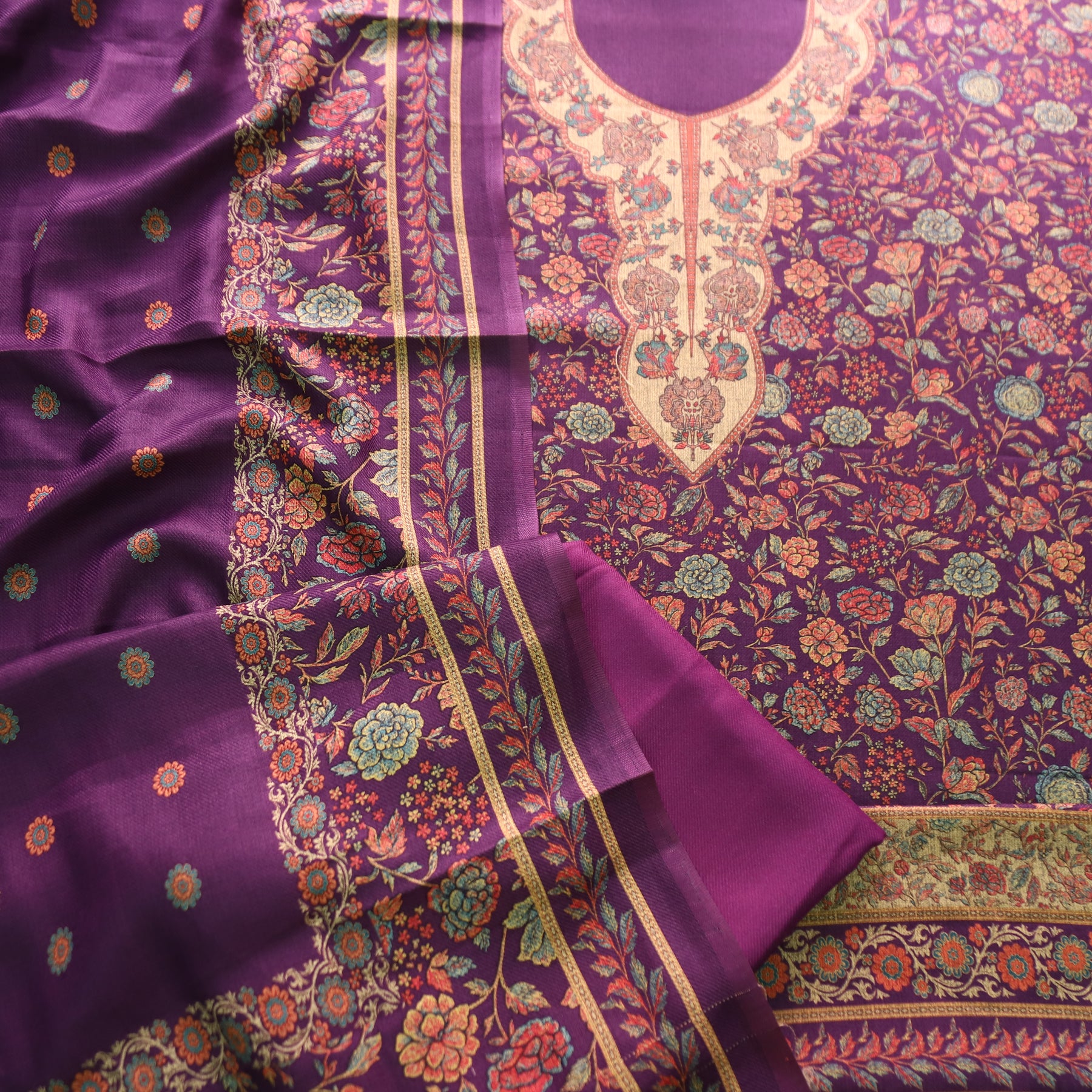 Work- A luxurious semi pashmina suit set adorned with rich paisley and floral woven patterns in vibrant hues, exuding timeless elegance. The top features intricate woven detailing inspired by Kashmiri craftsmanship, paired with a coordinated printed semi pashmina dupatta and a solid bottom, creating a regal and graceful winter ensemble.