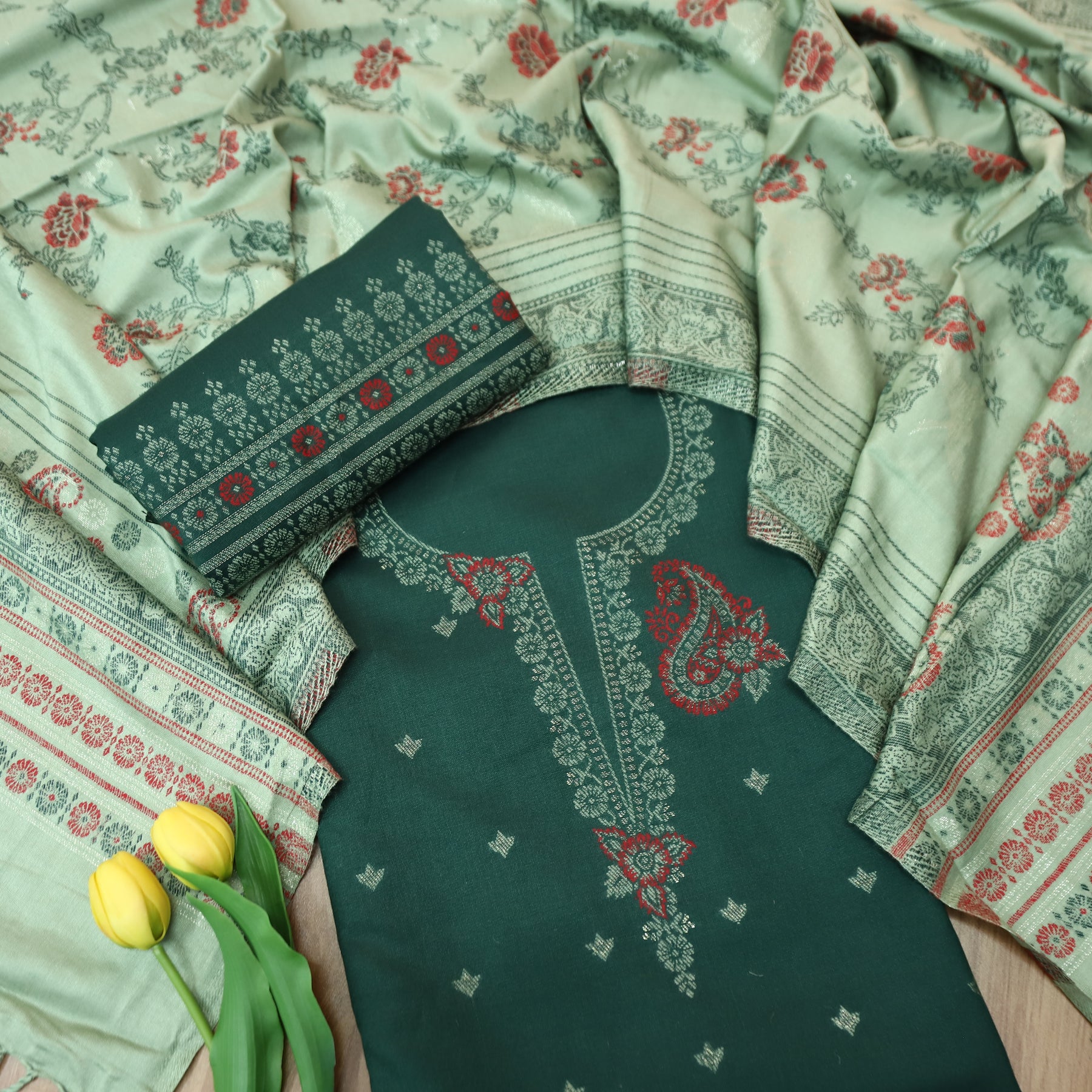 चांदनी Dark Green All Over Thread and Zari Weaved Neck Semi Pashmina Winter Set