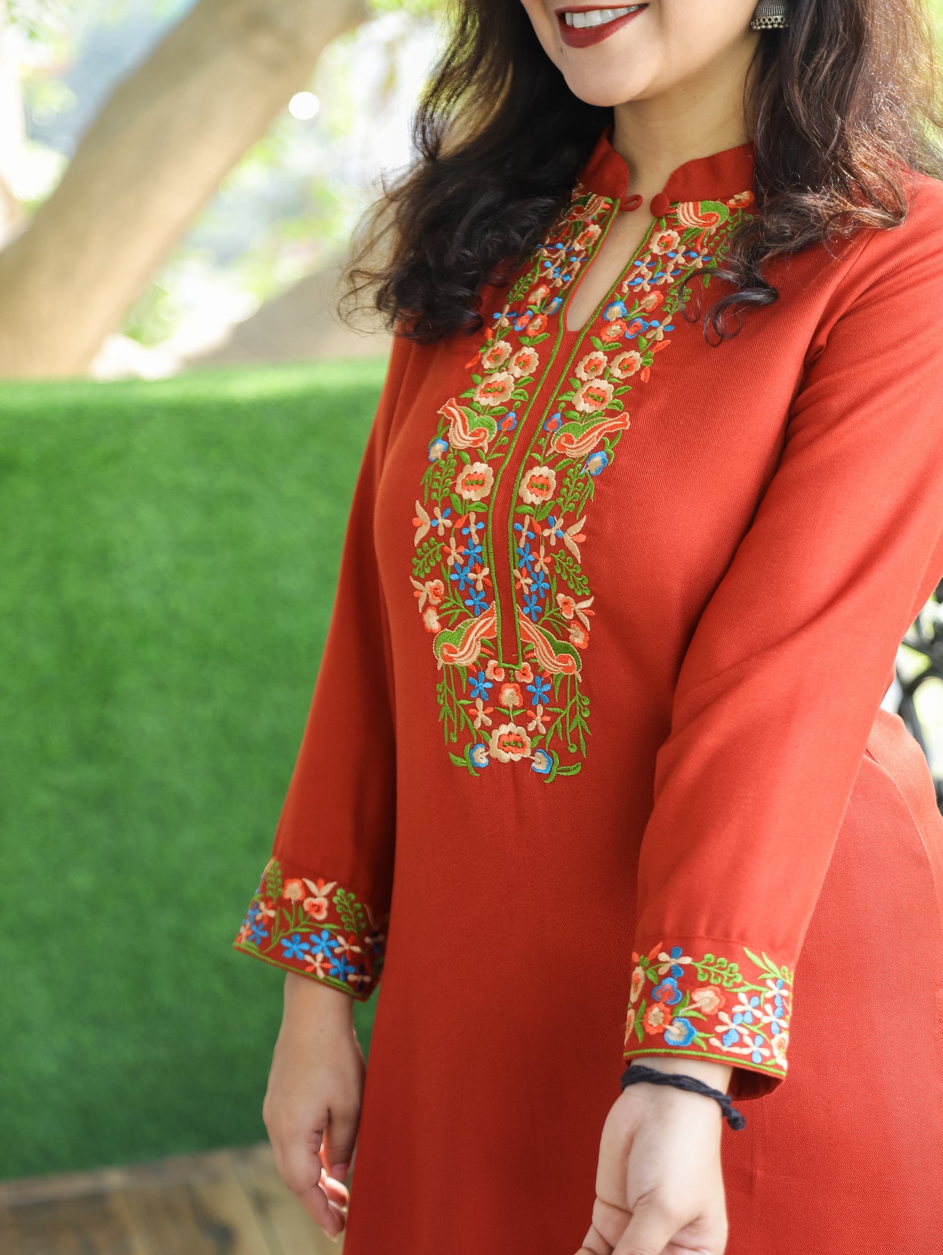 छाया Dusty Rust Thread Embroidered Neck Semi Pashmina Winter Kurti