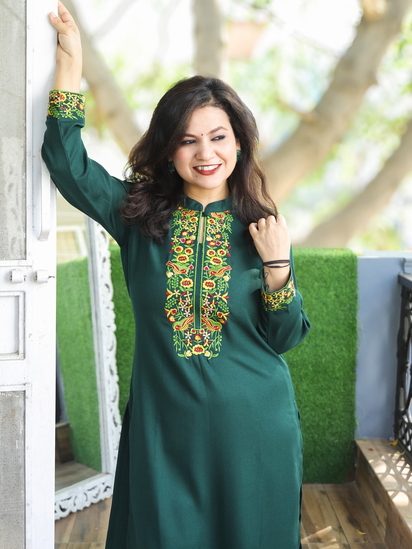 छाया Dark Green Thread Embroidered Neck Semi Pashmina Winter Kurti