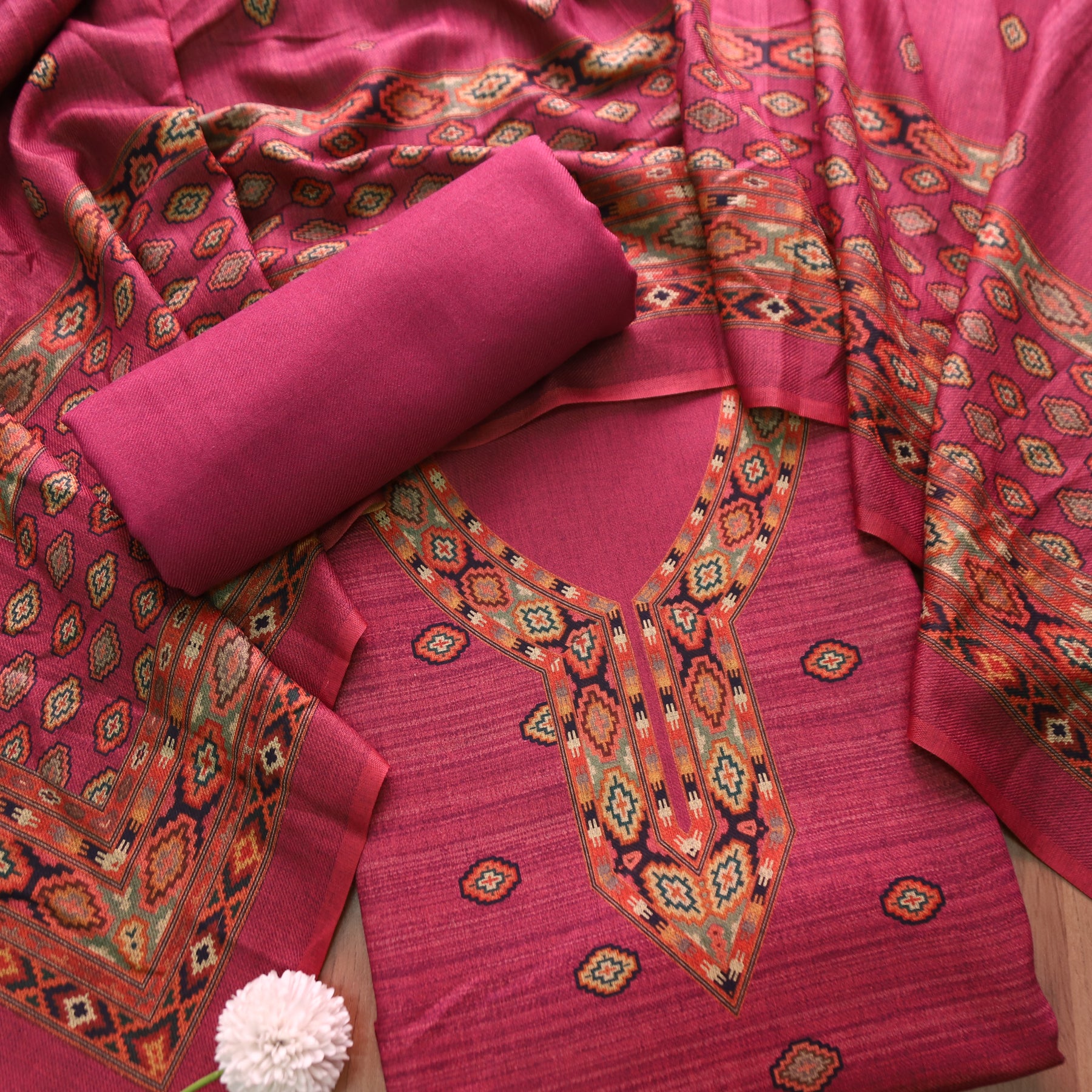 Work- A luxurious semi pashmina suit set adorned with rich patterns in vibrant hues, exuding timeless elegance. The top features intricate woven detailing inspired by Kashmiri craftsmanship, paired with a coordinated printed semi pashmina dupatta and a solid bottom, creating a regal and graceful winter ensemble.