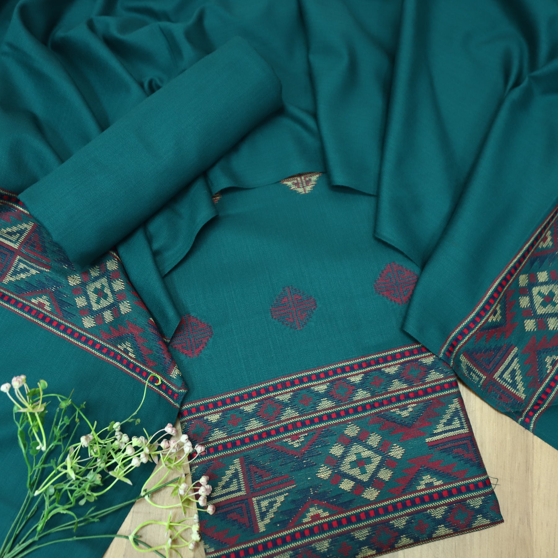 Work-Elevate your winter elegance with this exquisite Semi Pashmina Suit Set. The top is beautifully adorned with intricate Kullu-inspired thread weaving along the hemline, showcasing fine craftsmanship and traditional artistry. Complementing it is a matching semi pashmina dupatta, gracefully detailed with elegant Kullu embroidery on the borders, adding warmth and sophistication to the ensemble. Perfect for cozy festive gatherings or refined daytime outings.