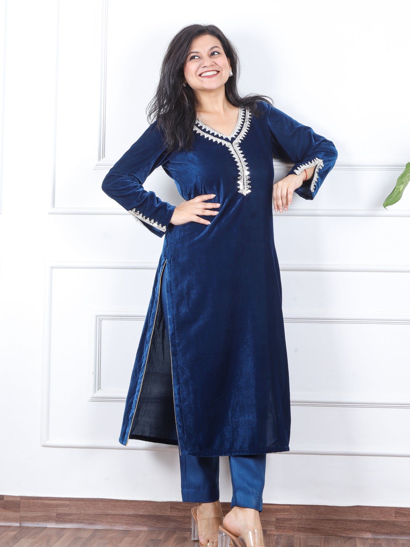 सजना Royal Blue Lace Neck Work Velvet Winter Kurti-D1