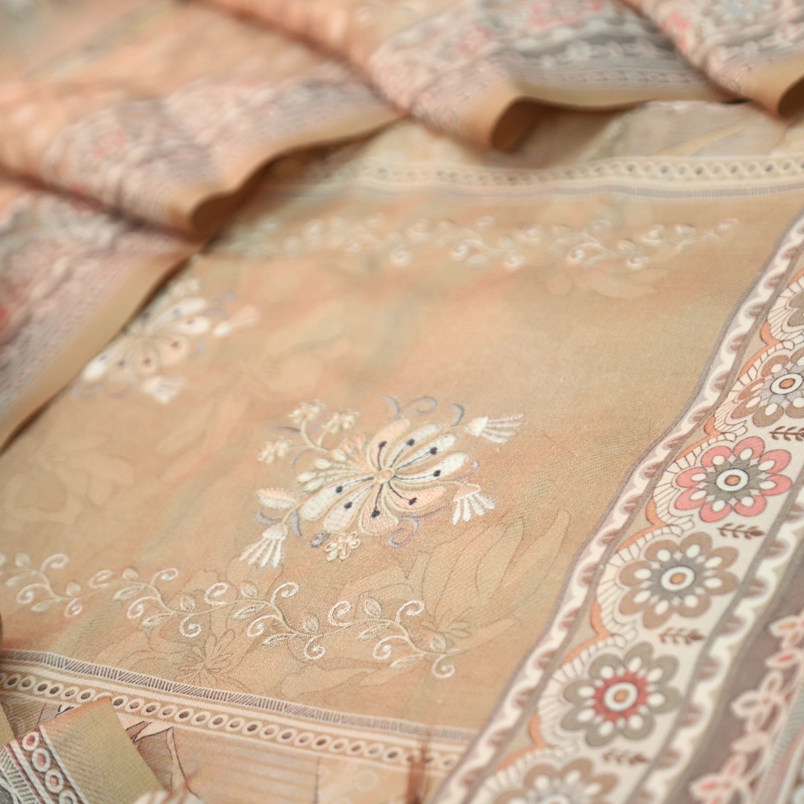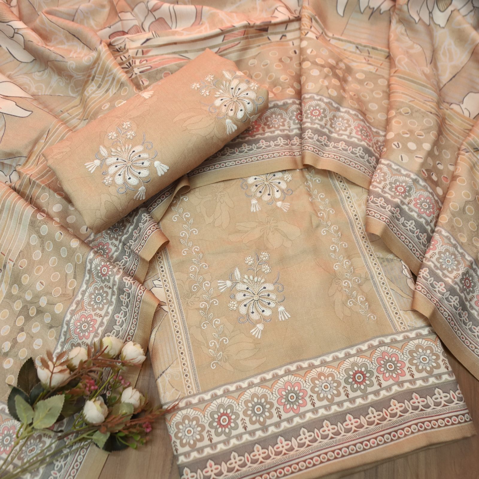 हरदीप Pastel Peach Defined By Floral Printed Work Semi Pashmina Winter Set