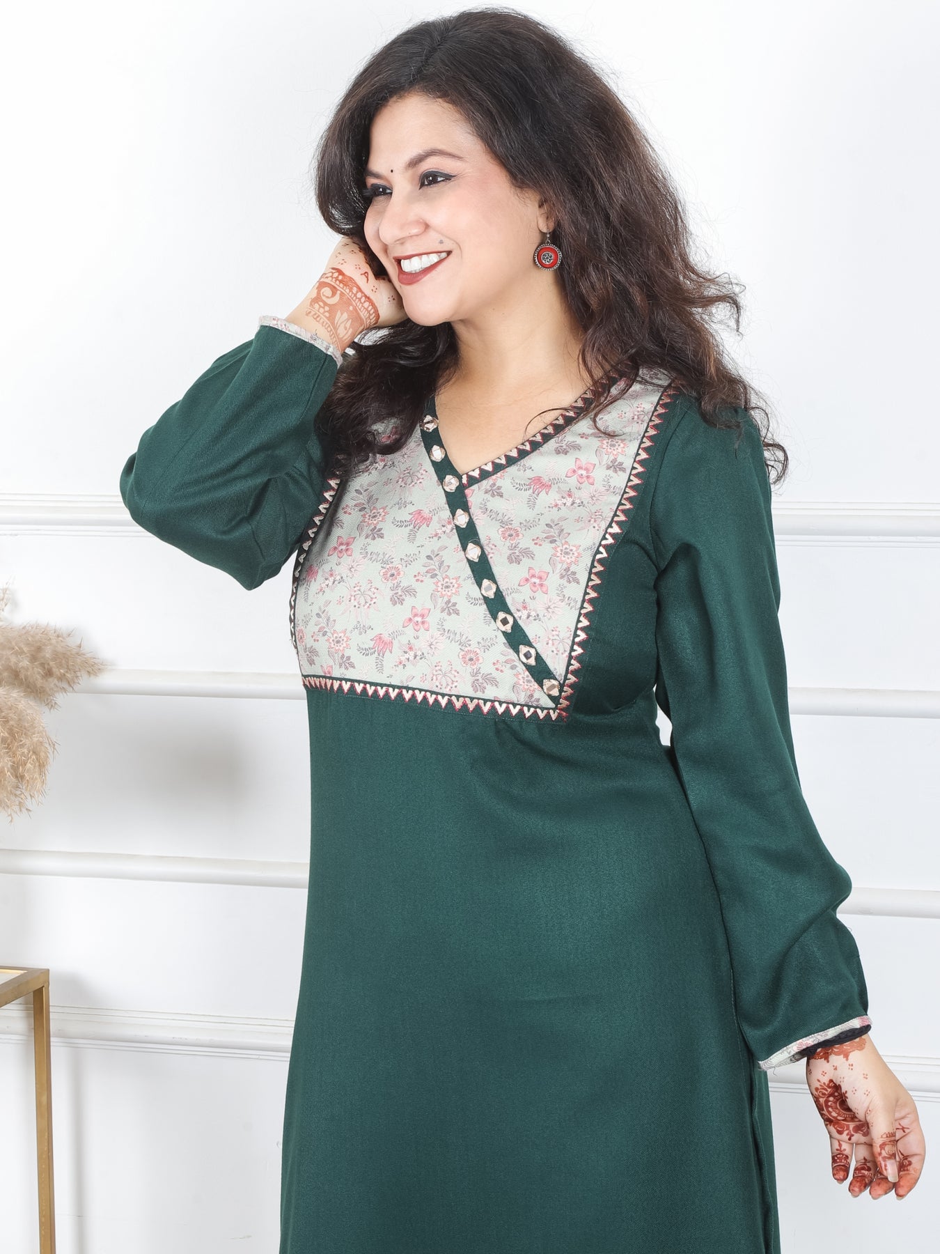 Heer Dark Green Floral Patch with Mirror in Angrakha Neck Semi Pashmina Winter Kurti
