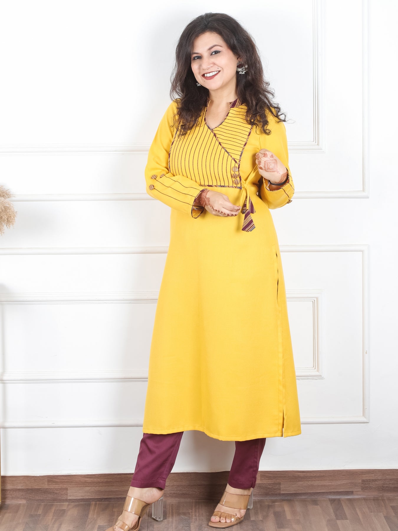 Shanti Corn Yellow Ban Collar Angrakha Neck with Detailing Semi Pashmina Winter Kurti