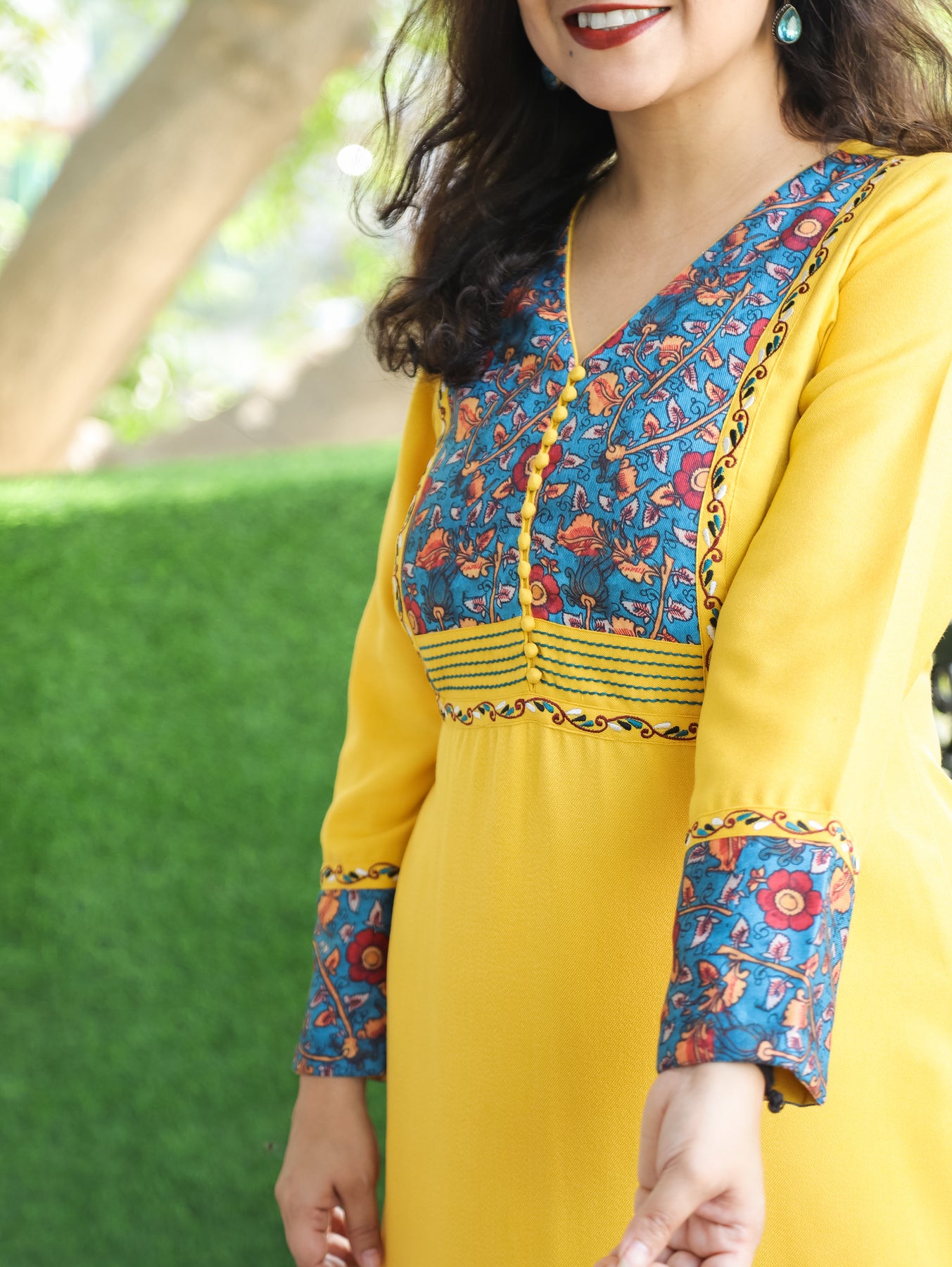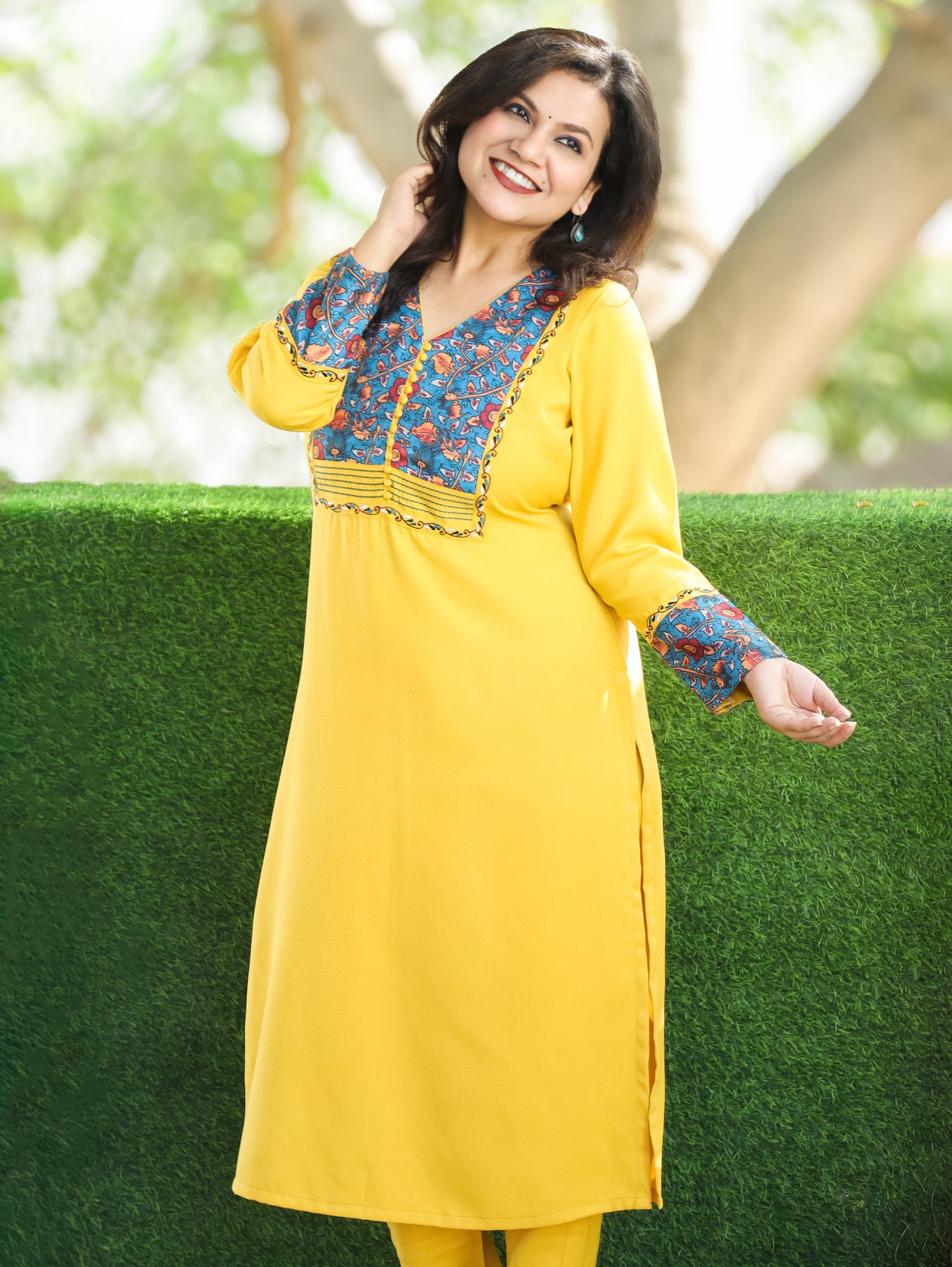 Tarang Bumblebee Yellow Potli Button Work in Kanni Yoke Semi Pashmina Winter Kurti