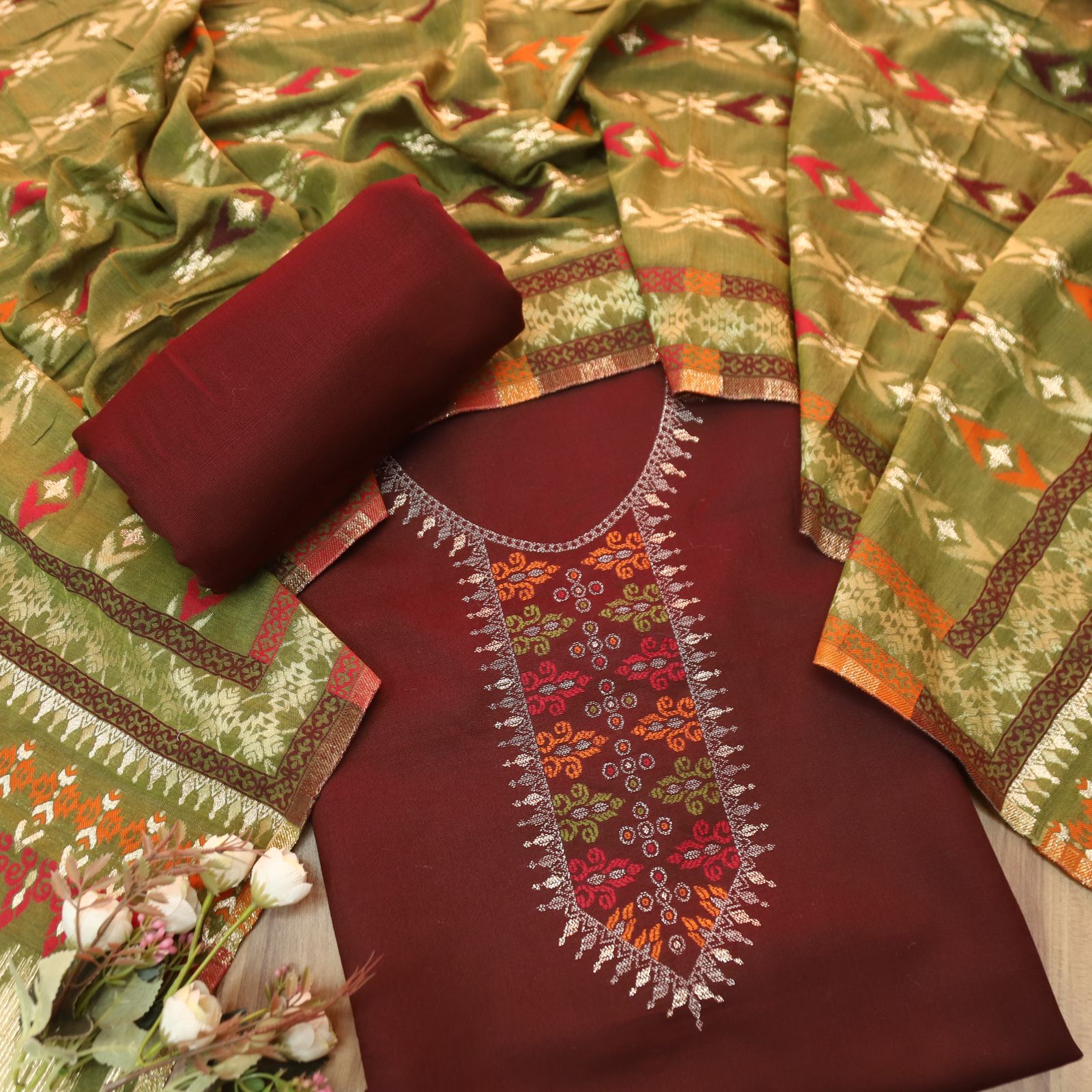 Work- A rich semi pashmina top beautifully enhanced with woven geometric motifs along the neckline and hem, exuding traditional artistry with a modern touch. Paired with a vibrant turquoise semi pashmina dupatta featuring all-over ethnic-inspired Brocade weaving, this ensemble strikes the perfect balance between color and craftsmanship. The soft, warm texture of semi pashmina ensures comfort during the winter season while maintaining an effortlessly elegant appeal.