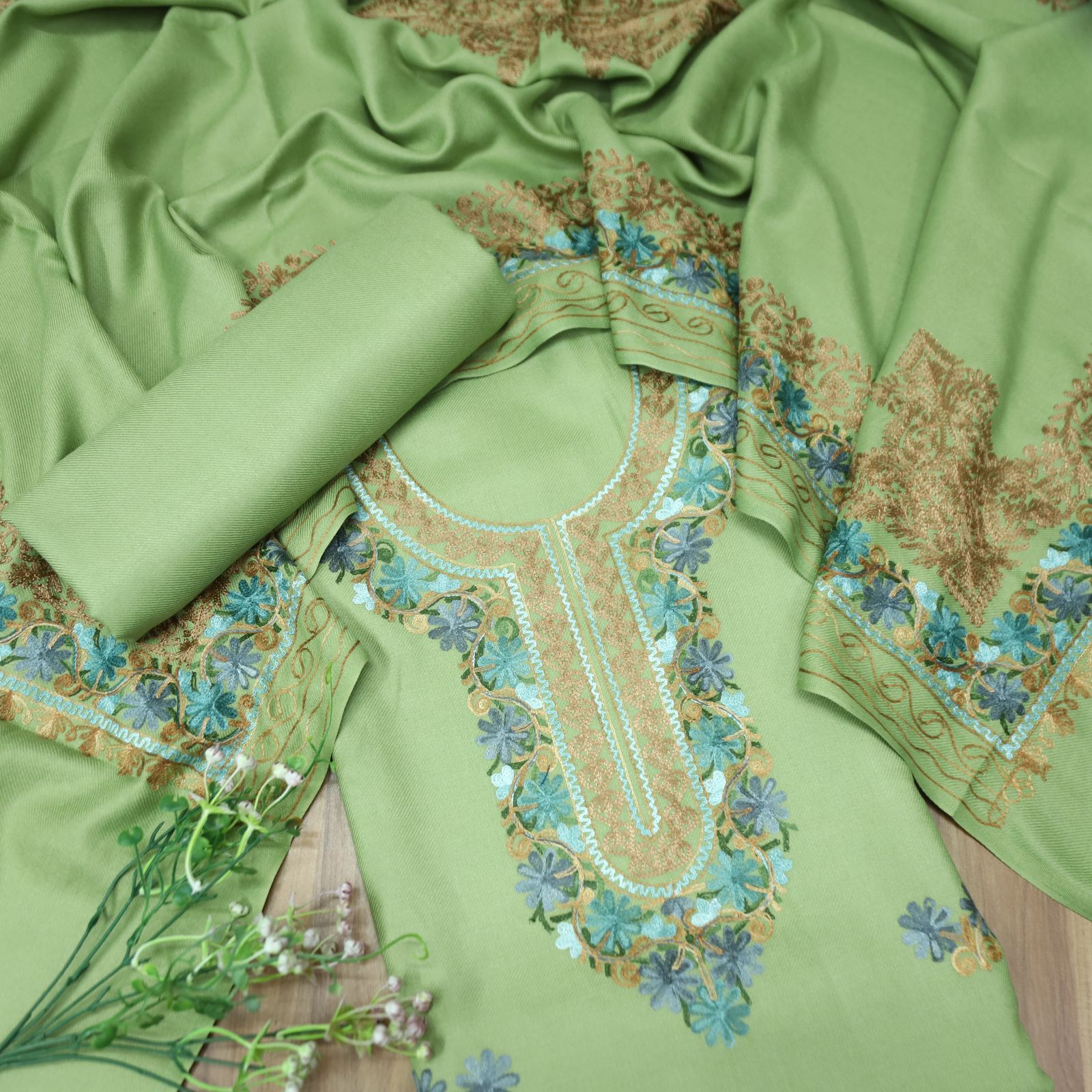 भानुशी Fern Green Elegant Woven Kashida Embroidery Semi Pashmina Winter Set