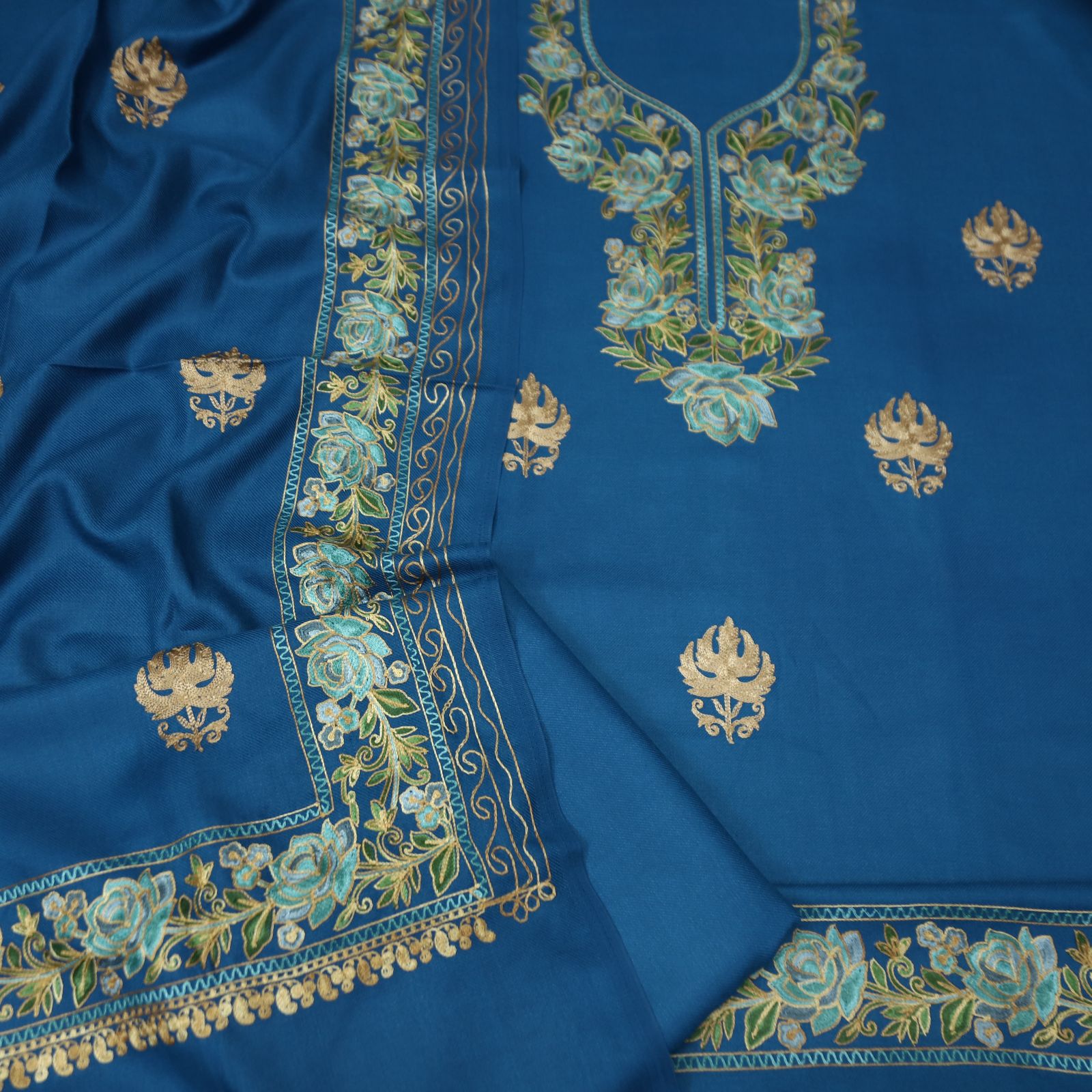 भानुशी Cerulean Blue Elegant Woven Kashida Embroidery Semi Pashmina Winter Set