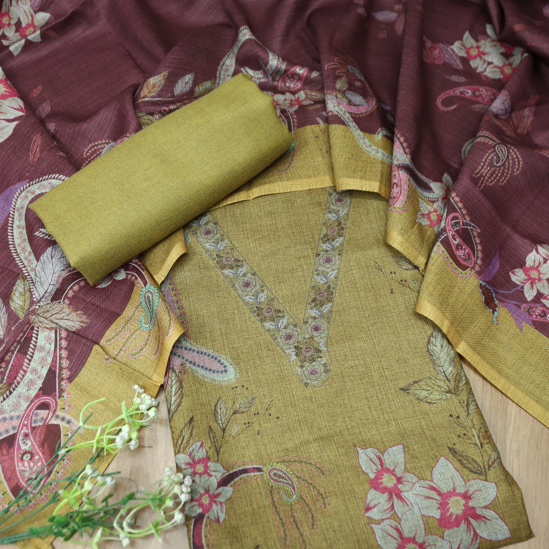 Work- This semi-pashmina suit set features a beautifully printed top with floral and paisley motifs, enhanced with subtle floral accents on the neckline. Paired with a plain matching bottom and a contrasting floral-printed dupatta, it offers a perfect fusion of warmth, color, and elegance for winter wear.